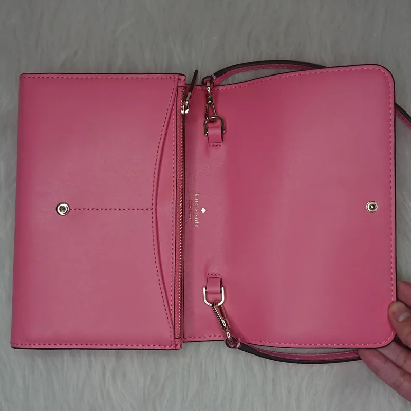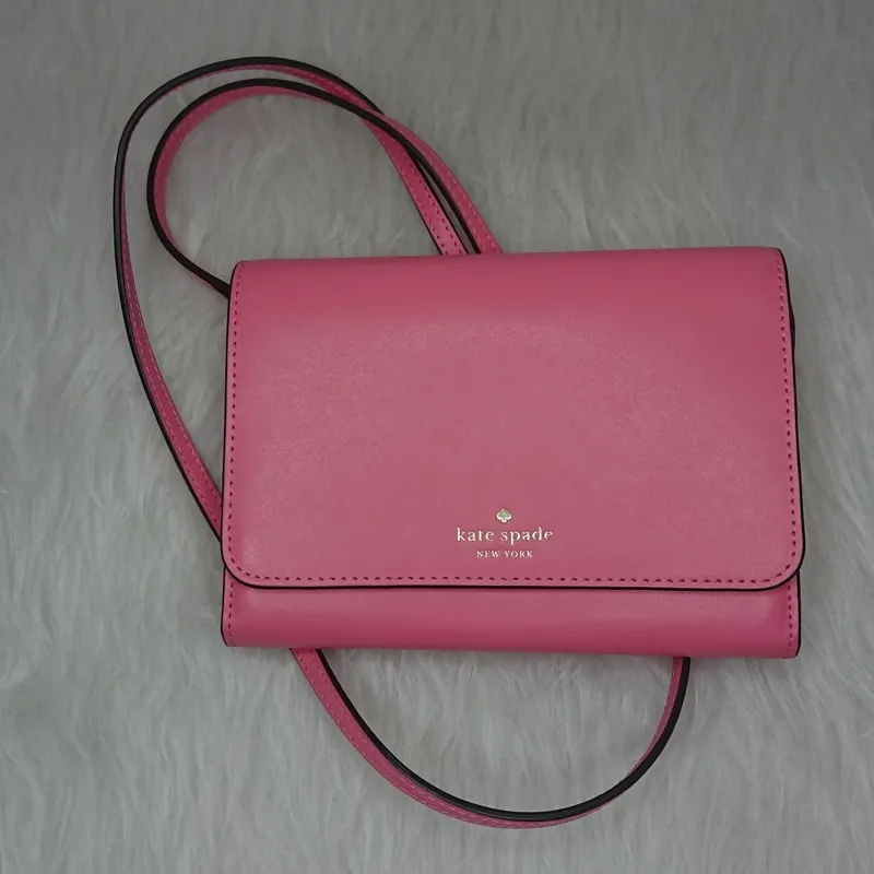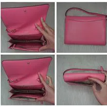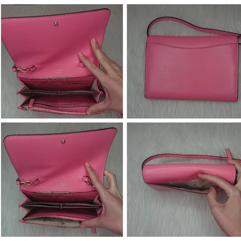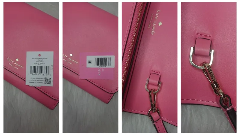 -نام کالا : kate spade kerri smooth leather small flap wallet crossbody bag bright blush ( میتونید در نت سرچ کنید و از اوریجینال بودنش مطمئن بشید ، در صورتی که بارکد روی تگ محصول رو هم اسکن بفرمایید ، تمامی اطلاعات کیف رو براتون نمایش میده ) .