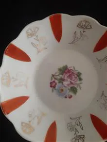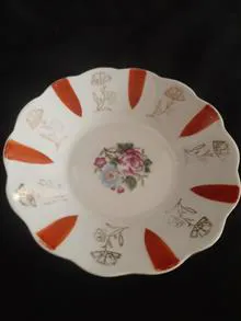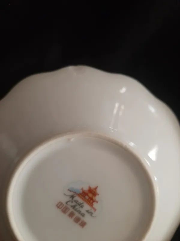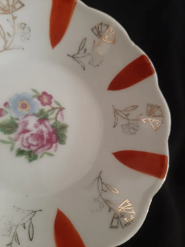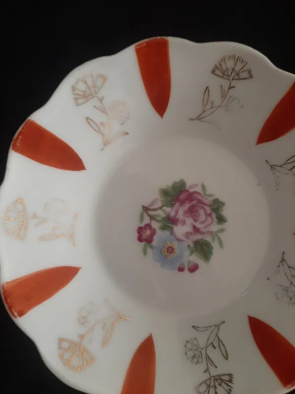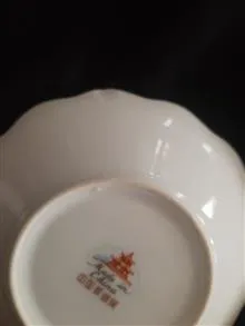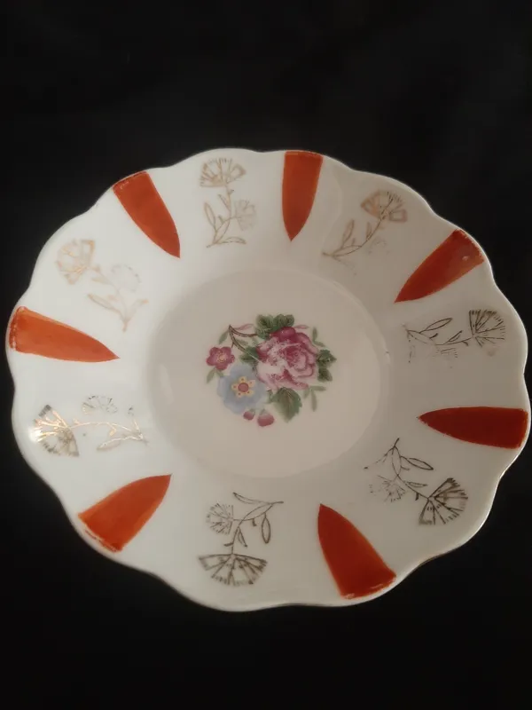 یک عدد نعلبکی تو گود مارک کلبه قطر 11 گلهای نقاشی با اب طلا یک لبپری در پشت دارد و یک ناصافی در حد یک صدم میلیمتر در رو دست دوم خط و خش ممکن است دیده شود