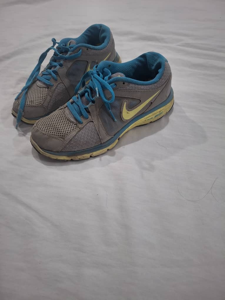 1 جفت کفش اسپورت نایک طوسی آبی ساخت ویتنام سایز 39 دو سه جا زدگی دارد ولی قابل استفاده