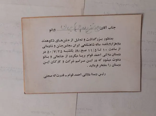 دعوتنامه حضور در بزرگداشت جشنهای 2500 سال شاهنشاهی