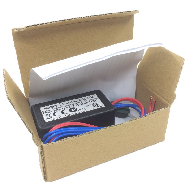 دستگاهی که در دست دارید یک سیستم الکترونیکی هوشمند مجهز به سنسور نور می باشد که به صورت خودکار چراغ های خودرو را نسبت به شدت نور محیط روشن وخاموش می نماید. این آپشن روی تمامی خودروهای مدل بالا نصب است، با این پکیج هم آپشن جدید به خودروی خود اضافه کنید و هم از راحتی استفاده از این سیستم لذت ببرید. با نصب بسیار راحت و بدون تغییر در سیمکشی خودرو با قابلیت اتومات کردن هر دو چراغ کوچک و بزرگ با قابلیت انتخاب. جعبه مشکی در زیر داشبورد نصب شده و چشمی آن که مانند چشمی اصلی است در کنار ستون سمت راننده بوسیله چسب دوطرفه ای که همراهش هست بر روی داشبورد نصب میشود. 1- قاب بالایی پشت فرمان را باز کنید. 2- سیم مشترک کلید روشنایی چراغ کوچک و بزرگ را پیدا کنید، به سیم خروجی از دسته چراغ دقت کنید، سه عدد سیم نازک از نوک دسته چراغ به سمت سوکت دسته چراغ کشیده شده که یک سیم برای چراغ کوچک و یک سیم برای چراغ بزرگ و سیم دیگری مشترک (معمولا مشکی) میباشد، و یا آنرا بر روی سوکت چراغ پیدا نمایید. پس از آنکه سیم مشترک چراغ کوچک و بزرگ را پیدا کردید آنرا بریده و به دو سر بوجود آمده دو سیم آبی بلند که از دستگاه آمده را متصل کنید. 3- قاب ستون سمت راننده را جدا کرده و چشمی دستگاه را در گوشه شیشه روی داشبورد قرار داده و سیم و سوکت آنرا به پایین داشبورد هدایت کنید، سعی کنید چشمی در جایی نصب شود که در معرض بیشترین میزان نور محیط قرار گیرد. از چسب دو طرفه زیر چشمی برای نصب استفاده کنید و حتما قبل از نصب محل نصب روی داشبورد را با دستمال و مواد پاک کننده کاملا تمیز کنید تا چسب دو طرفه کاملا روی داشبورد بچسبد، سپس روکش کاغذی روی چشمی را از آن جدا نمایید. 4- سیم برق مشکی را به بدنه و یا منفی باتری متصل کنید. 5- سیم قرمز را به پله دوم سوییچ خودرو (برق پشت آمپر) متصل کنید. 6- سوکت چشمی را به محل مورد نظر روی دستگاه متصل نمایید. 7- دستگاه را در زیر داشبود و زیر پای راننده در جای مناسب توسط بست کمربندی متصل کنید. زمان روشن و خاموش شدن سیستم بسته به میزان نور برخورد شده با چشمی دارد، این زمان بصورت پیشفرض در بهترین حالت تنظیم گردیده است، در صورت لزوم میتوانید با استفاده از ولومی که روی مدار قرار دارد زمان روشن و خاموش شدن را تغییر دهید. پیشنهاد میشود جهت دوری از هرگونه تغییر ناخواسته در رفتار دستگاه از این ولوم استفاده نکنید.
