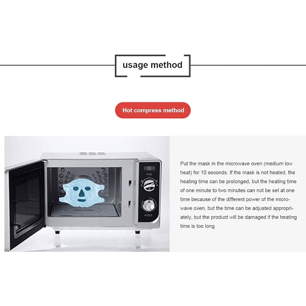 مایکروفر یا چند ساعت در فریزر قرار دهید. سپس آن را کمی با دست ماساژ دهید و سپس به صورت ببندید. طرف دیگر ماسک هم از جنس پارچه بسیار نرم است تا صورت راحت باشد. می توان هر دو طرف ماسک را روی صورت بست.