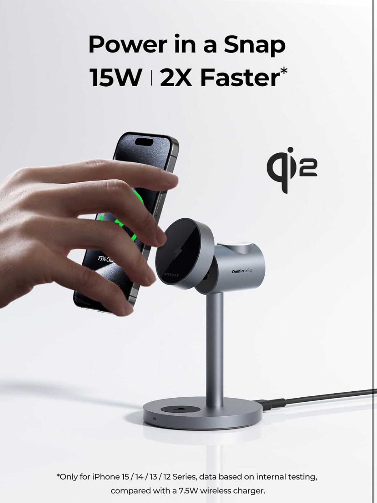 شارژ فوقالعاده سریع 15 واتی: این پایه شارژر مغناطیسی با گواهی Qi2 برای اطمینان از سازگاری، شارژ فوقالعاده سریع 15 واتی چشمگیری را برای سری آیفون 17/16/15/14/13/12 شما ارائه میدهد. این پایه میتواند آیفون 16 را در 30 دقیقه از 0 تا 38 درصد شارژ کند.