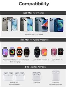 شارژ بهینه برای اپل واچ: شارژر بیسیم دارای گواهی MFW ما حداکثر عملکرد و سازگاری را با اپل واچ تضمین میکند. با ارائه حداکثر 5 وات توان، میتواند تا 50 درصد ظرفیت را تنها در 30 دقیقه برای اپل واچ سری 9 یا مدلهای بالاتر شارژ کند.