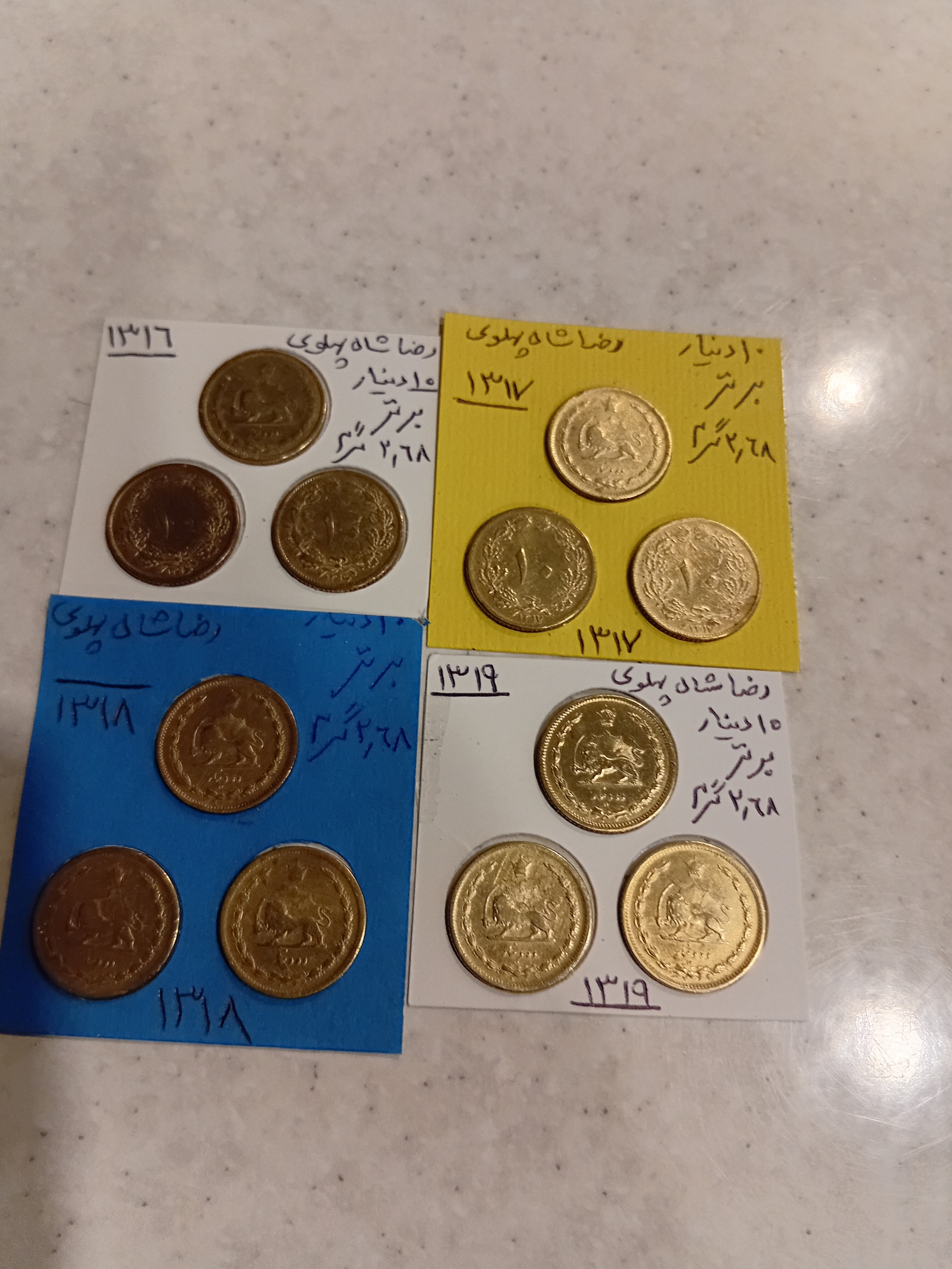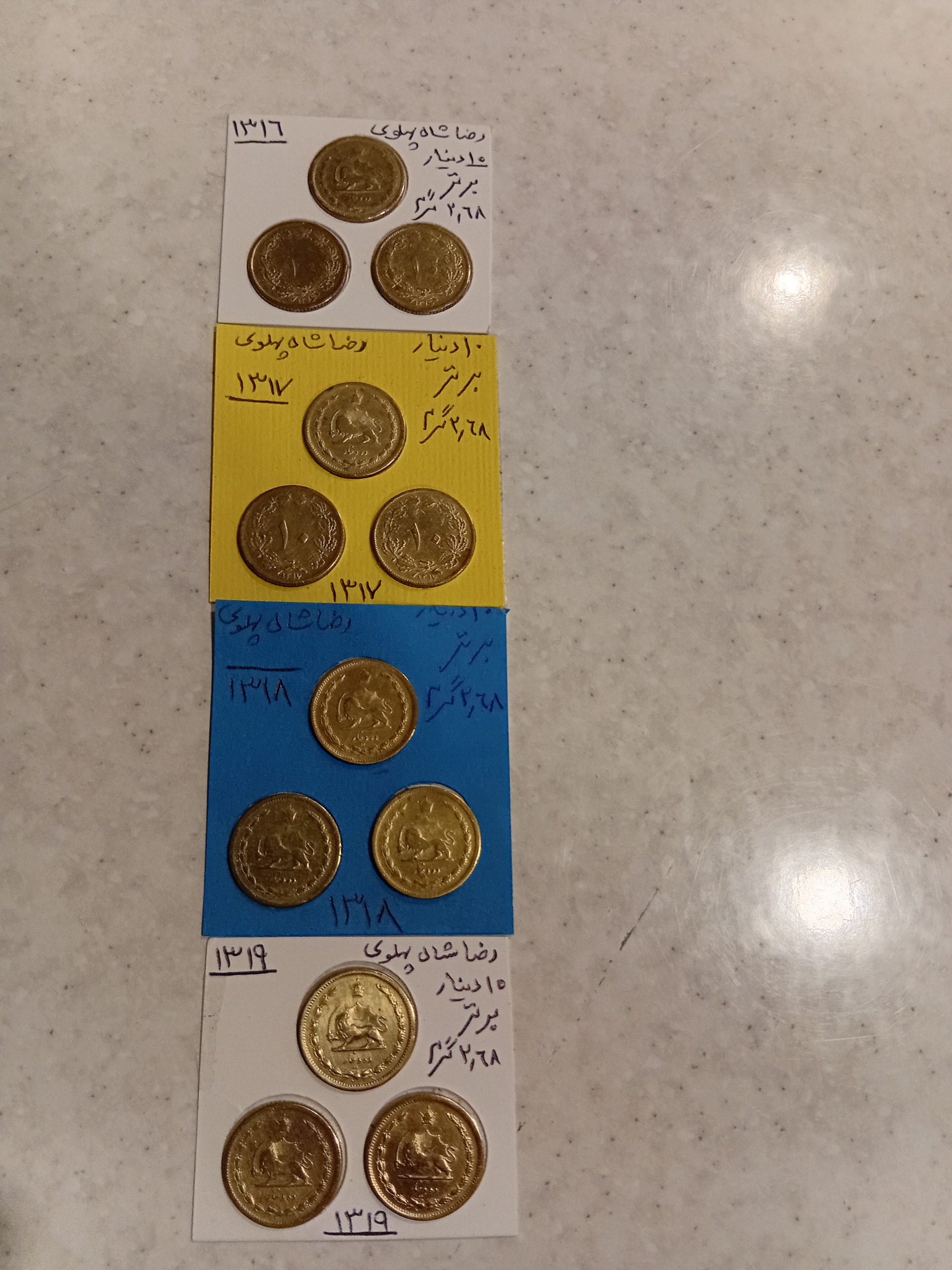 ست سکه های 10دینار 3عددی رضا شاه سال های 1316  1317 1318 1319 شامل 12 عدد سکه در حد بانکی ، با قیمت کاملا رقابتی هر عدد 300 تومان .                       کیفیت مطابق تصاویر و این کالا مرجوعی ندارد در صورت هر سوالی در خدمت هستم ، سلامت باشید .