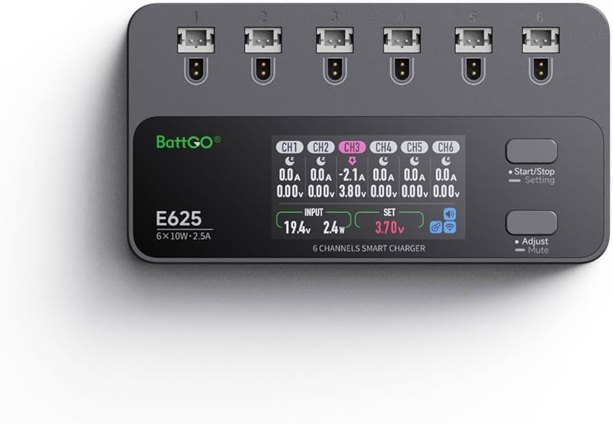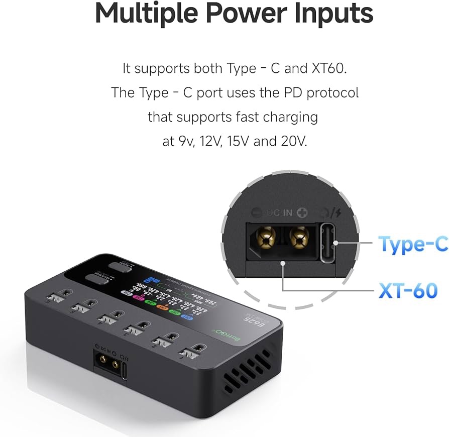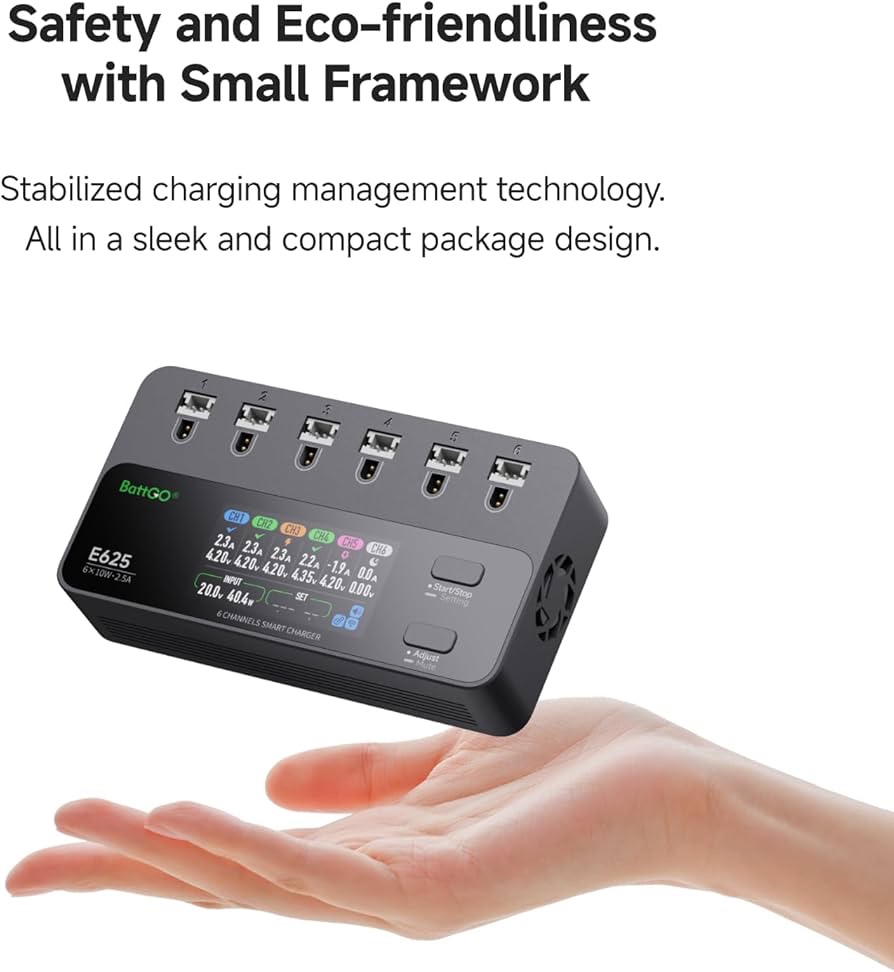شارژر باتری قابل حمل ISDT E625 با ظرفیت 6 پورت و 1 سل لیتیوم-یون نوع C، 4.35 ولت 2 آمپر، دارای کانکتور BT2.0/PH2.0 برای باتریهای 300/450/500/600 میلیآمپر ساعت FPV