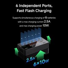 6 پورت مستقل، شارژ سریع: پشتیبانی از شارژ همزمان 6 باتری با حداکثر جریان شارژ 2.5 آمپر و حداکثر توان شارژ 10 وات.