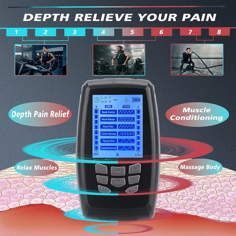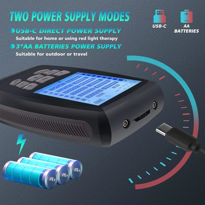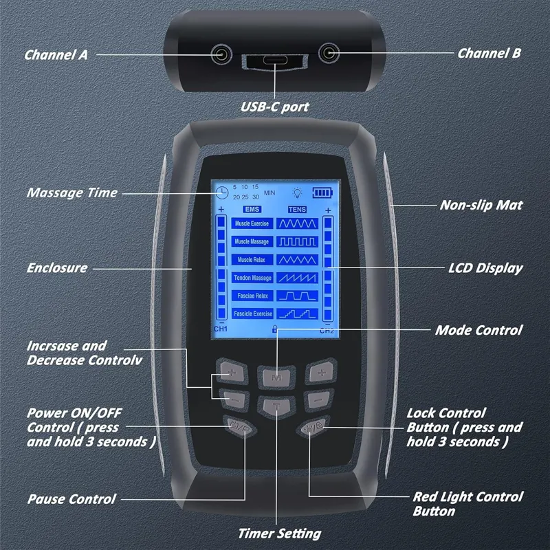 دستگاه تحریک عضلات TENS، دستگاه TENS EMS دو کاناله با قدرت بالا برای تسکین درد گردن، PMS، کمر و عضلات، ماساژور پالس الکترونیکی با 6 پد الکترود و کیف مسافرتی دستگاه TENS تسکیندهنده درد حرفهای: ماساژور الکتریکی TENS به تسکین درد عضلات و مفاصل ناشی از ورزش، فشار بیش از حد یا کارهای روزمره خانه کمک میکند. طراحی ساده پنل دستگاه TENS EMS به شما امکان میدهد حالت مورد نظر خود را به طور شهودیتر انتخاب کنید. همه حالتها کنترل دقیقی را برای تسکین درد و تسکین سفتی عضلات ارائه میدهند. با ماساژور پالسی الکتروتراپی TENS و لوازم جانبی آن، بدن خود را آرام کنید و در هر زمان درد را مدیریت کنید. دستگاههای TENS دو کاناله مستقل A/B: میتوانید شدتهای جداگانهای را برای کانال A و کانال B برای تسکین درد تنظیم کنید. آرامش کامل بدن: برای گردن، شانهها، پشت، کمر، بازوها و پاها استفاده کنید و این را به قدرتمندترین ابزار برای آرامش بدن خود تبدیل کنید. در هر زمان و هر مکان با خانواده و دوستان خود لذت ببرید. (توجه: لطفاً قبل از تغییر حالت، شدت را روی 0 تنظیم کنید تا از تحریک شدید جلوگیری شود) چند منظوره و حرفه ای: دستگاه TENS دارای دو روش تامین برق است، یکی منبع تغذیه مستقیم TYPE-C، و دیگری روش تامین برق، قرار دادن باتری های 3AA است که به شما امکان می دهد در سناریوهای مختلف بهتر عمل کنید. دستگاه TENS EMS مجهز به نور درمانی قرمز است، می توانید ناحیه دردناک را با نور قرمز از پشت روشن کنید تا درد تسکین یابد. عملکرد قفل می تواند از لمس تصادفی کلیدهای دیگر در حین استفاده و ایجاد آسیب جلوگیری کند. ارائه درمانی مفید برای تسکین درد.پدهای دستگاه TENS فوق ضخیم: پدهای جایگزین دستگاه TENS با ژل فوق ضخیم و رسانای بادوام و قابل اعتماد، چسبندگی خوب، انعطافپذیری خوب، قابل استفاده در قسمتهای مختلف بدن. توزیع جریان عالی. طراحی انحصاری برای گوشهای کوچک، برداشتن و جدا کردن آسان. کیف منحصر به فرد برای نگهداری و تمیز کردن آسانتر برای طول عمر بیشتر. پدهای دستگاه TENS با کیفیت بالا، قابل استفاده مجدد 30 بار