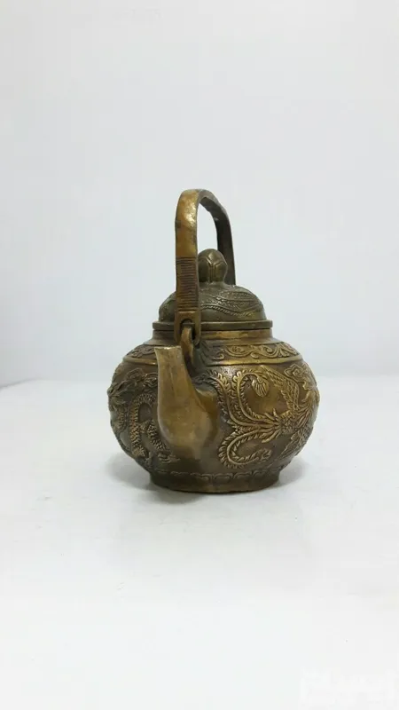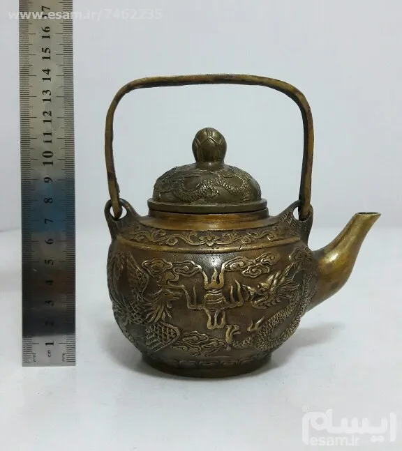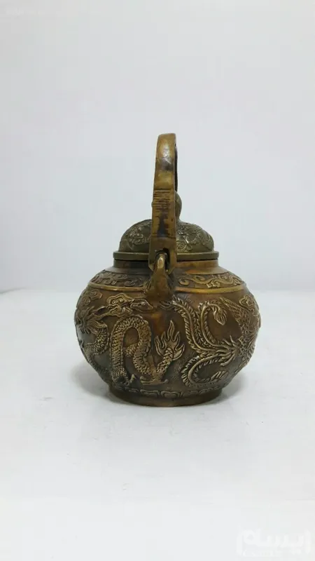 قوری برنزی دکوری نقش برجسته پرنده و اژدها ارتفاع قوری 12 سانت طول 14 سانت