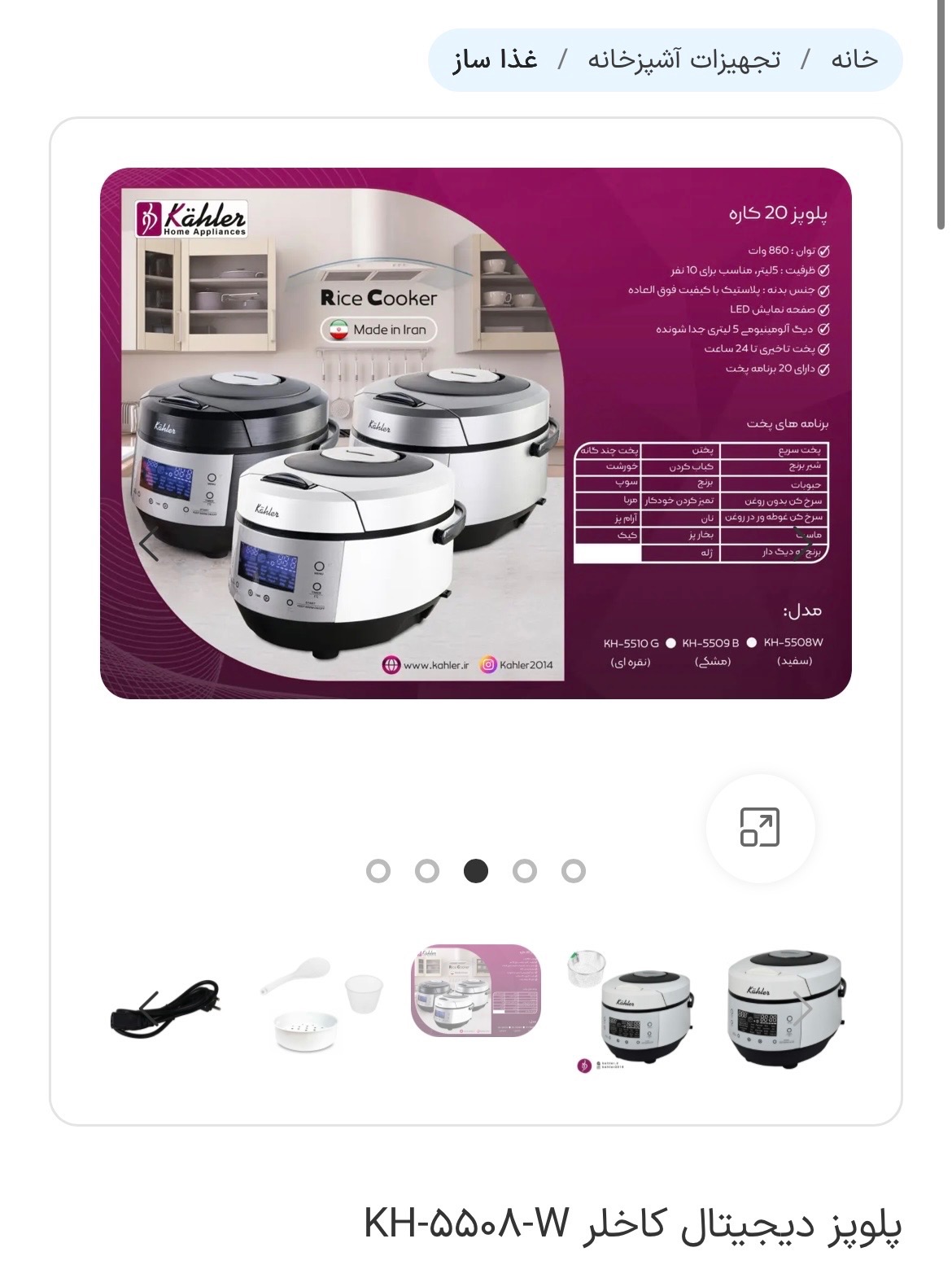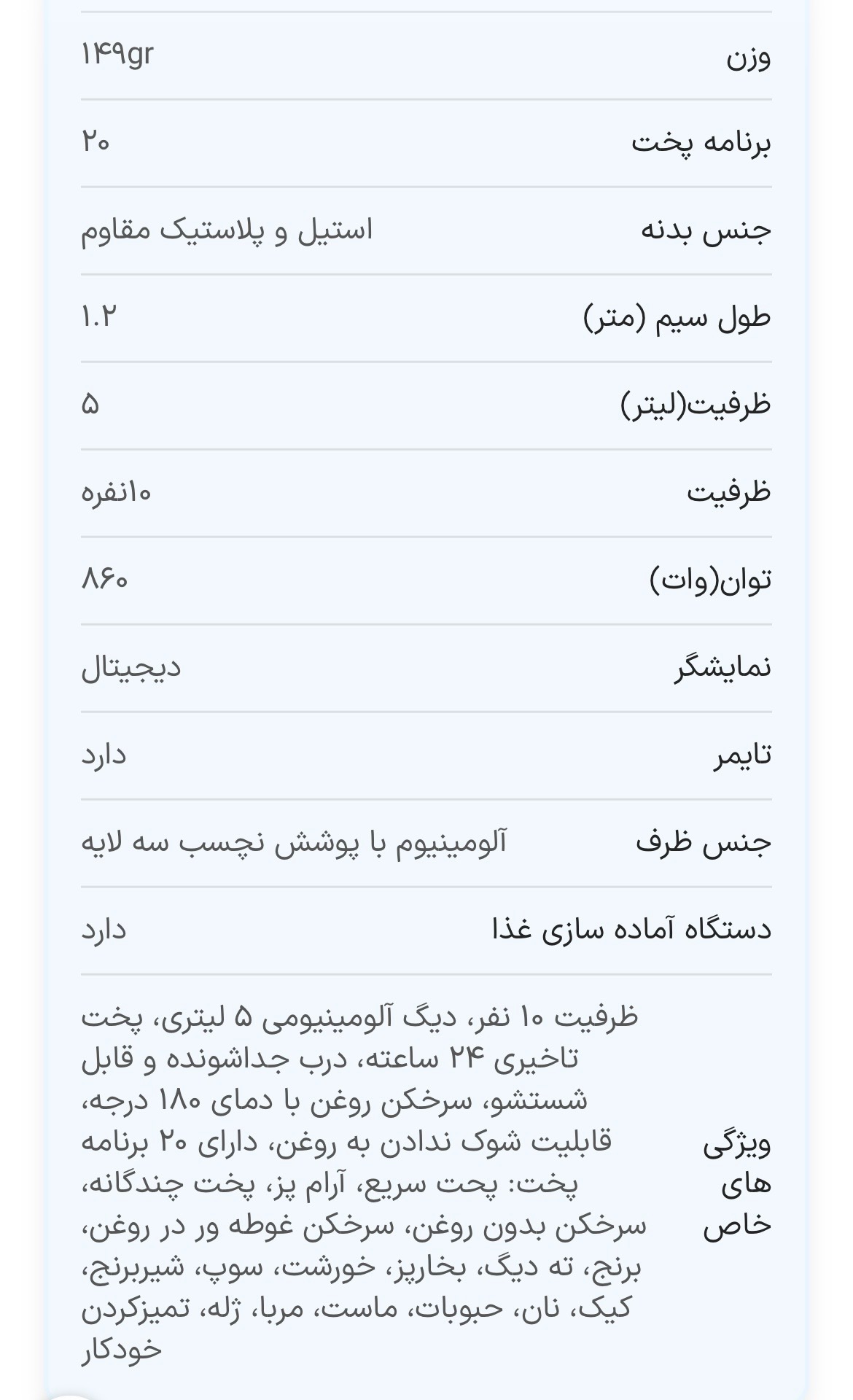 ظرفیت 10 نفر، دیگ آلومینیومی 5 لیتری، پخت تاخیری 24 ساعته، درب جداشونده و قابل شستشو، سرخکن روغن با دمای 180 درجه، قابلیت شوک ندادن به روغن، دارای 20 برنامه پخت: پحت سریع، آرام پز، پخت چندگانه، سرخکن بدون روغن، سرخکن غوطه ور در روغن، برنج، ته دیگ، بخارپز، خورشت، سوپ، شیربرنج، کیک، نان، حبوبات، ماست، مربا، ژله