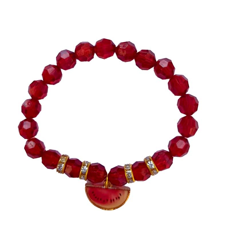 دستبند زنانه با سنگ های کریستالی قرمز که دارای آویز هنوانه ای شکل قرمز و طلایی در وسط دستبند می باشد.سنگ های دستبند به وسیله کش بادوام درست شده که قابل تنظیم با مچ دست میباشد و بهترین گزینه برای دادن هدیه است.