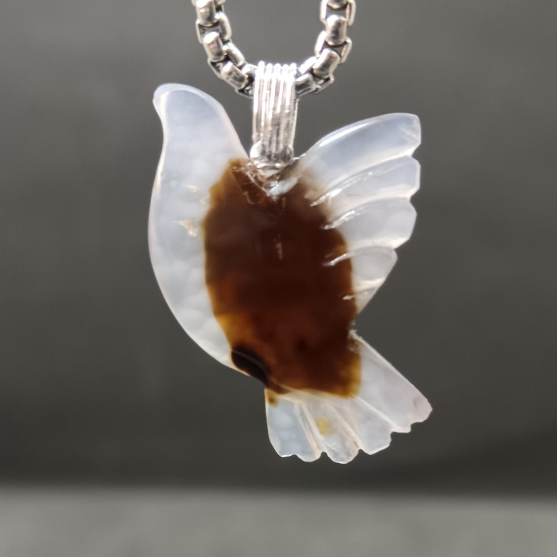 گردن آویز سنگ عقیق طرح کبوتر آزادی از سنگ عقیق طبیعی شفاف و مشکی تراش دست نمونه زیبا و منحصربهفرد سایز حدود 3 سانتیمتر ضخامت حدود 3 میلیمتر سبک و مناسب استفاده گردن آویز روزانه