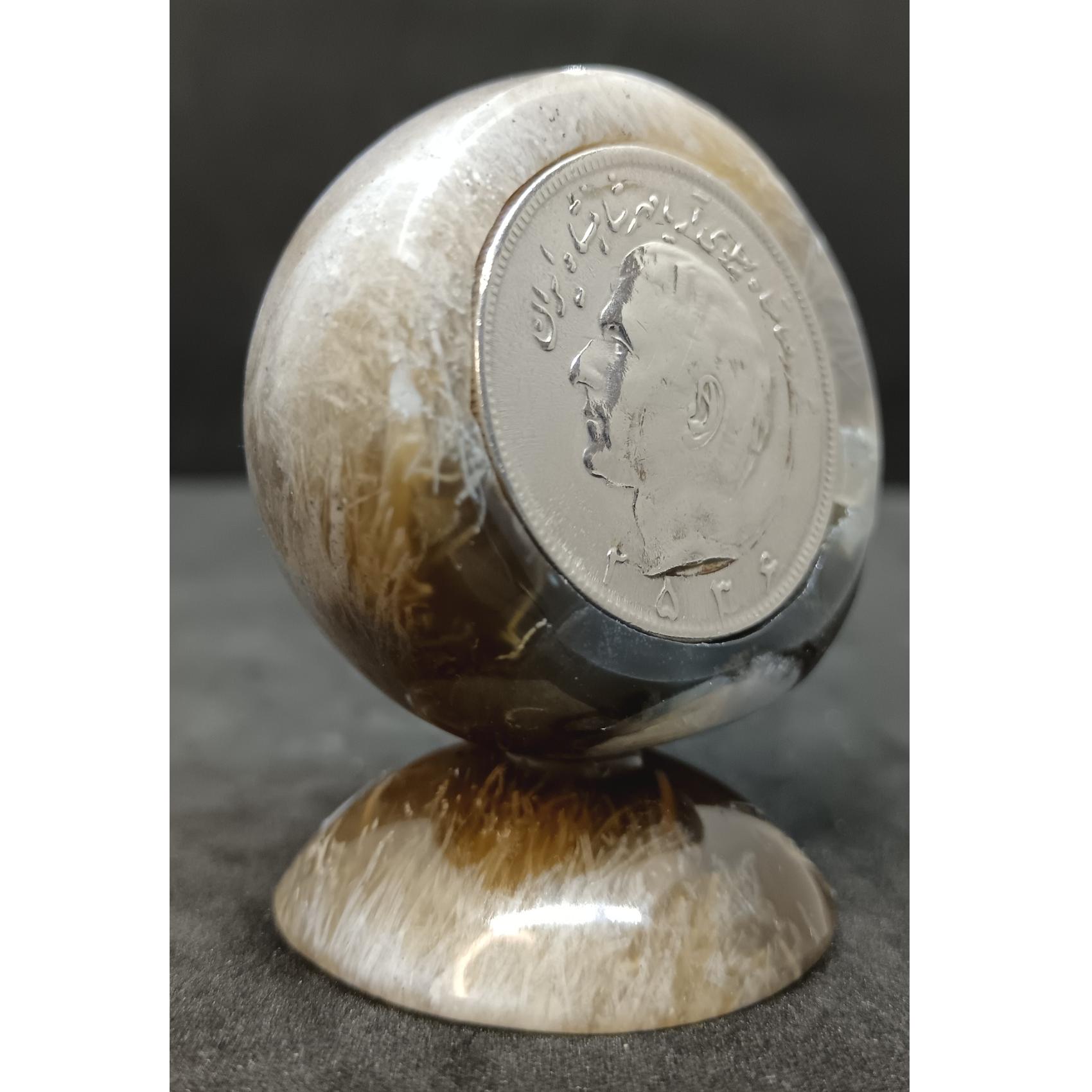 سنگ نمایه عقیق رتایل کلکسیونی دکوری مزین به سکه دوران پهلوی تراش دست سایز حدود 5سانتیمتر مناسب دکوری رومیزی و یا وزنه کاغذ کاری خاص و منحصربهفرد فقط یکعدد ساخته شده