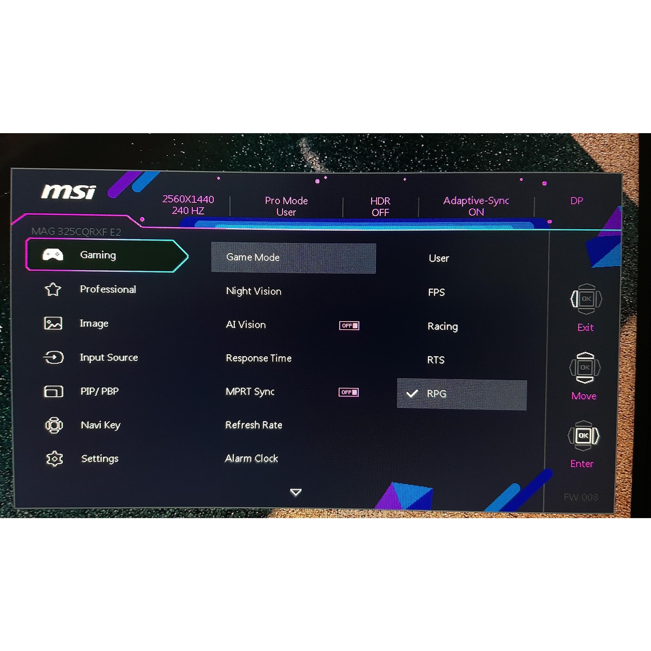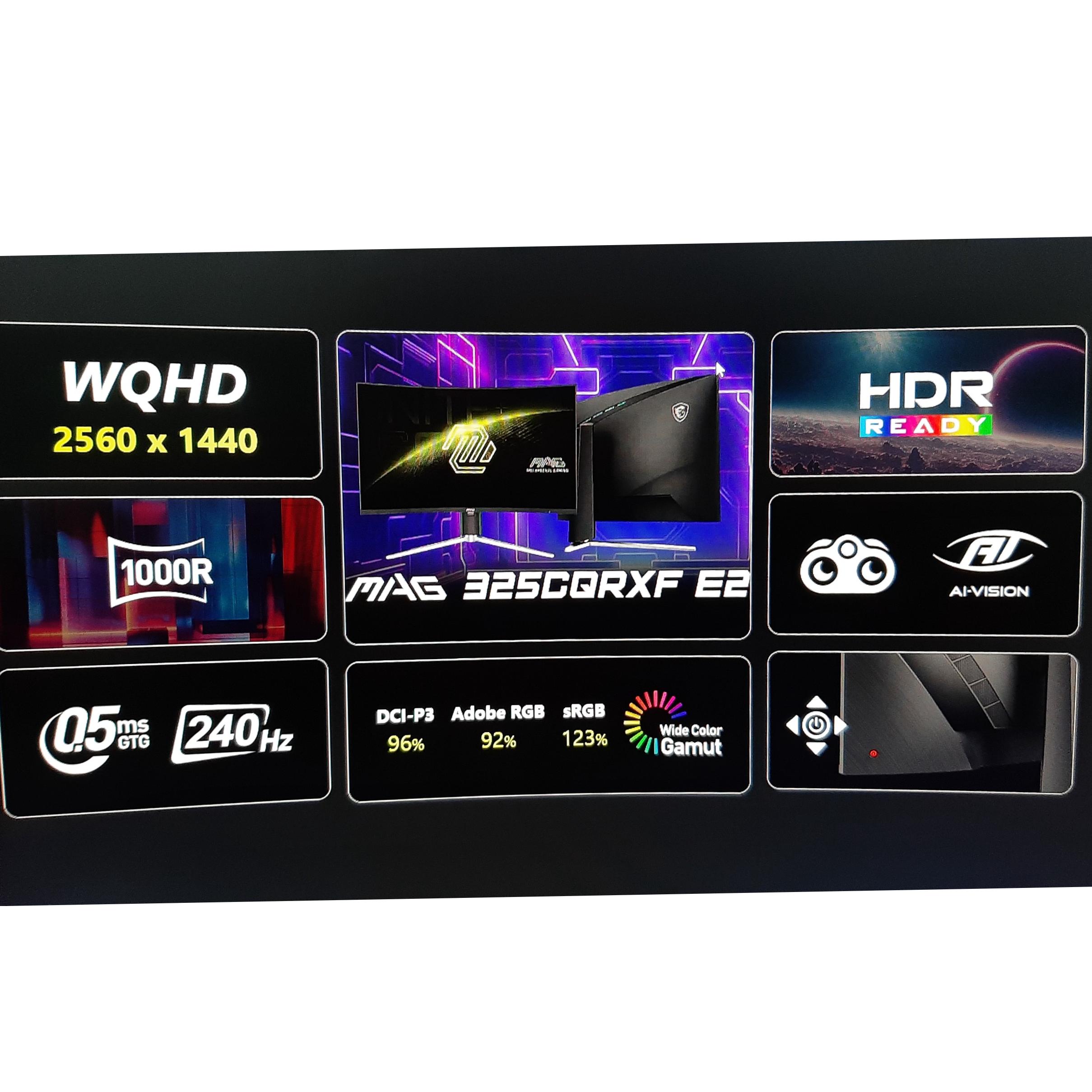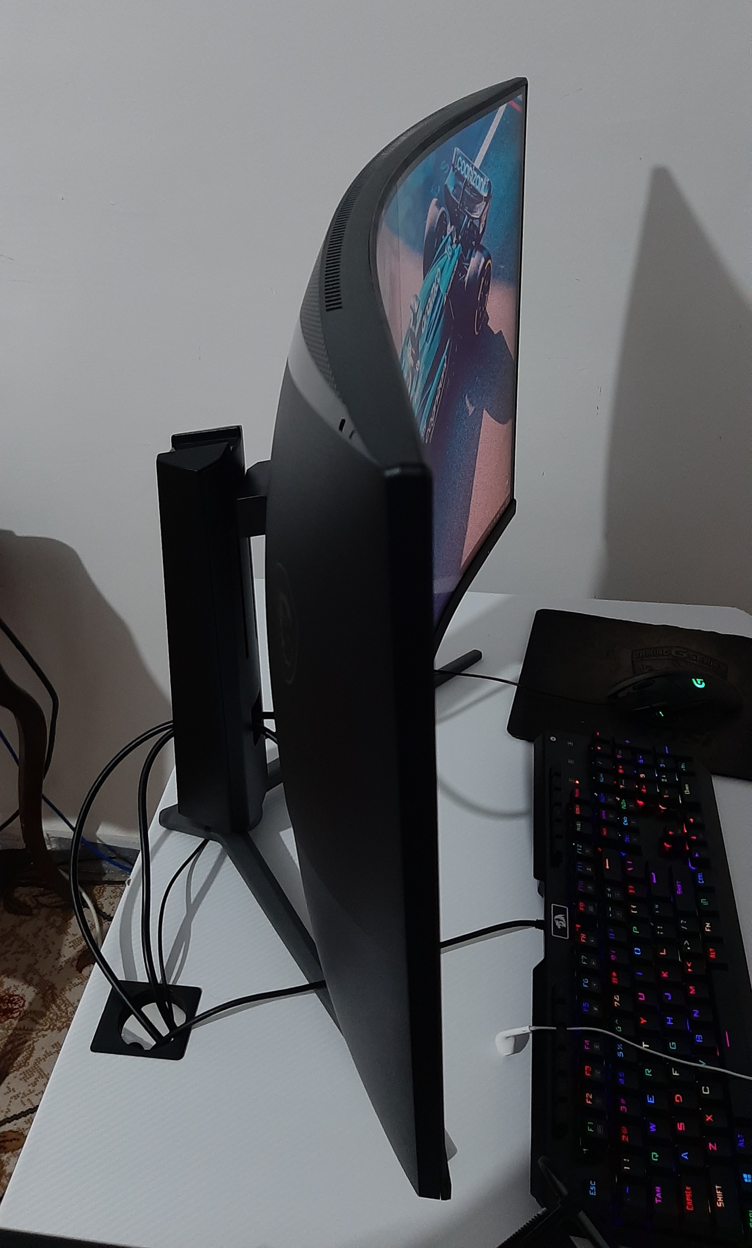 مانیتور گیمینگ MSI MAG 325CQRXF E2 با پنل Rapid VA و نرخ بروزرسانی 240 هرتز با تاخیر 0.5 میلی ثانیه 32 اینچه بدون پیکسل سوختگی و کاملا سالم و بدون کوچکترین خط و خش درگاه typeC هم داره که میتونید تنظیم کنید بعنوان شارژر استفاده بشه و جک 3.5mm خروجی صدا هم داره، پایه ش آسانسوری هستش و قابل تنظیمه با چرخش به چپ و راست حدودا 2 هفته س خریدم برای طراحی گرفتم بخاطر منحنی بودنش یکم اذیت میکنه و میخوام عوضش کنم نورپردازی RGB هم داره، تا اواخر 2027 گارانتی ماتریس داره
