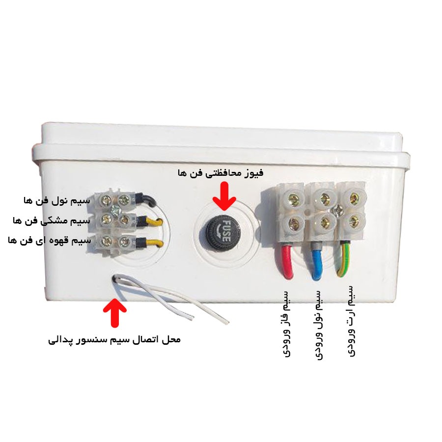 نصب یک عدد کلید 3 حالته (16 آمپری) جهت تعیین دور فن های سایلنت باکس (جهت زمان تابستانی و زمستانی) به همراه ترمینال های خروجی برای نصب سیم فن ها بر روی باکس