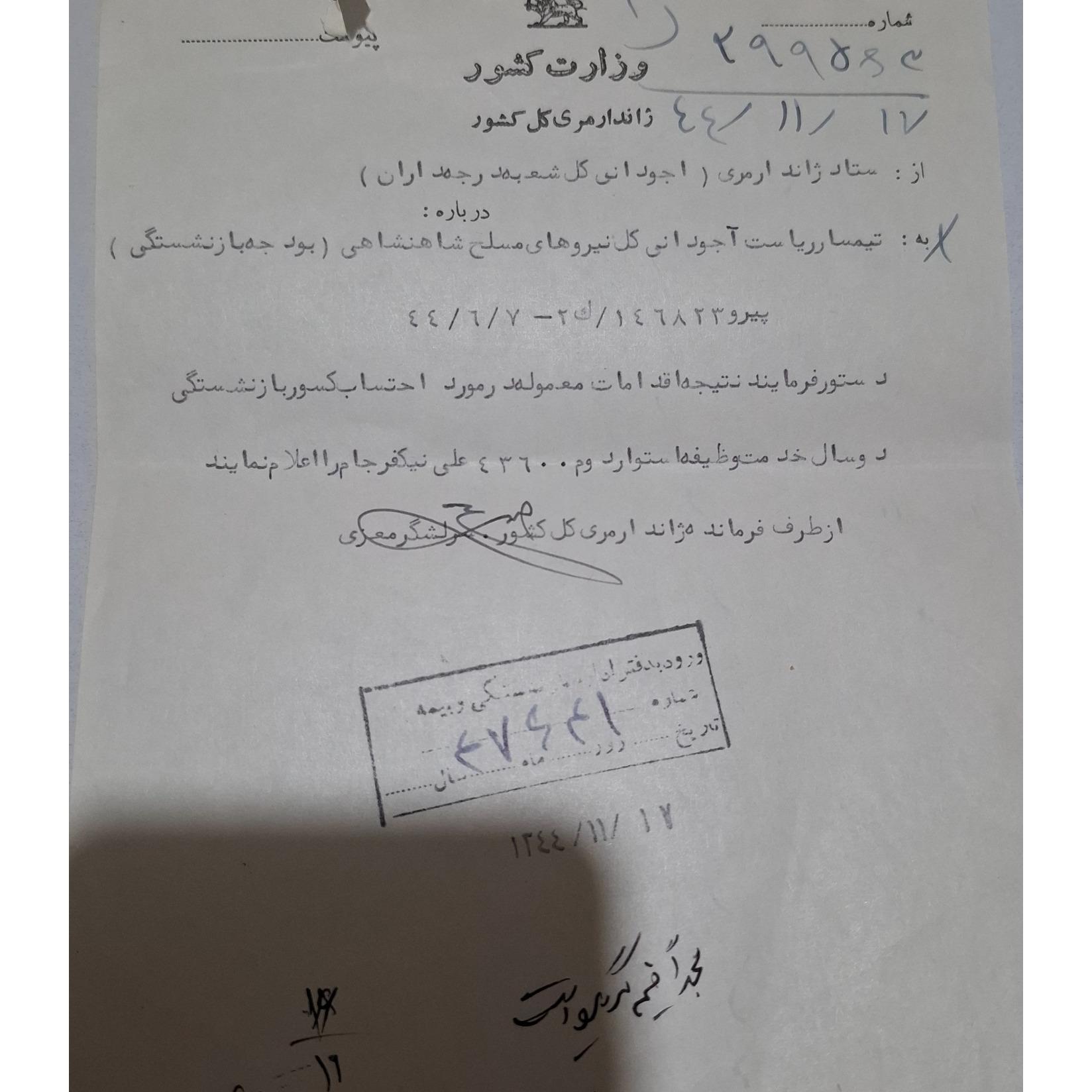 نامه با سربرگ ژاندارمری کل کشور به ستاد ژاندارمری آجودانی کل شعبه درجه داران مربوط ستوان دوم علی نیک فرجام سال 1344