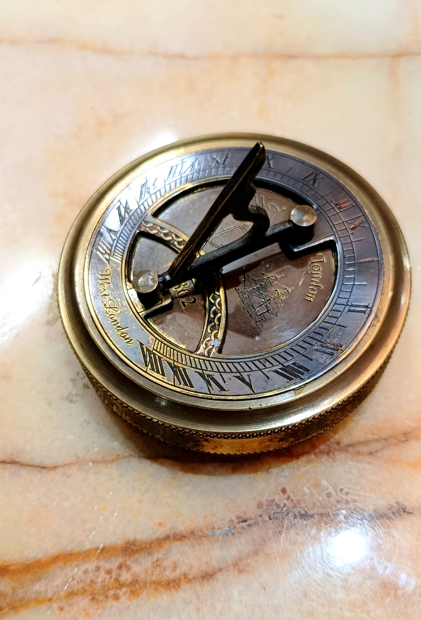 قطب نما وساعت خورشیدی برنز و آنتیک و کلکسیونی مارکدار و تاریخدار بسیار زیبا و باکیفیت دو تیکه پیچی که قطب نما و ساعت از هم جدا میشوند