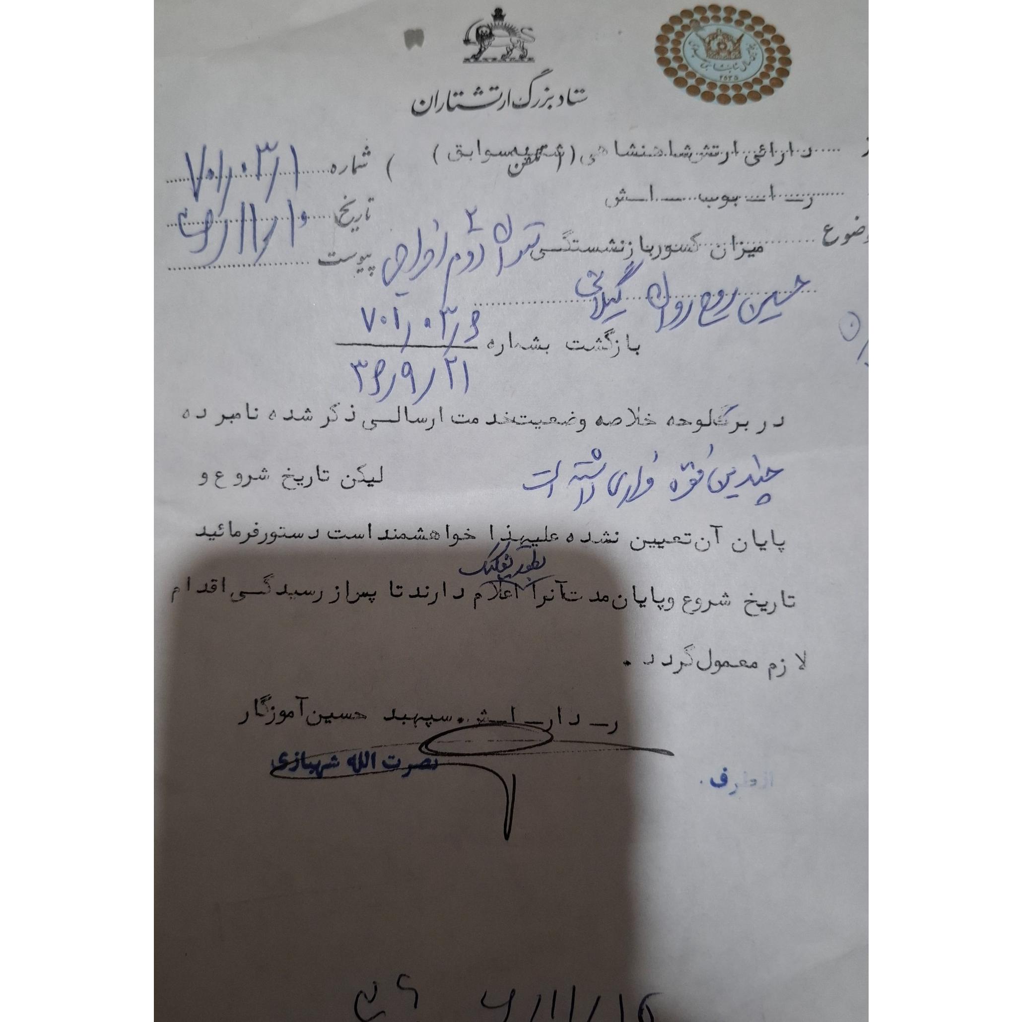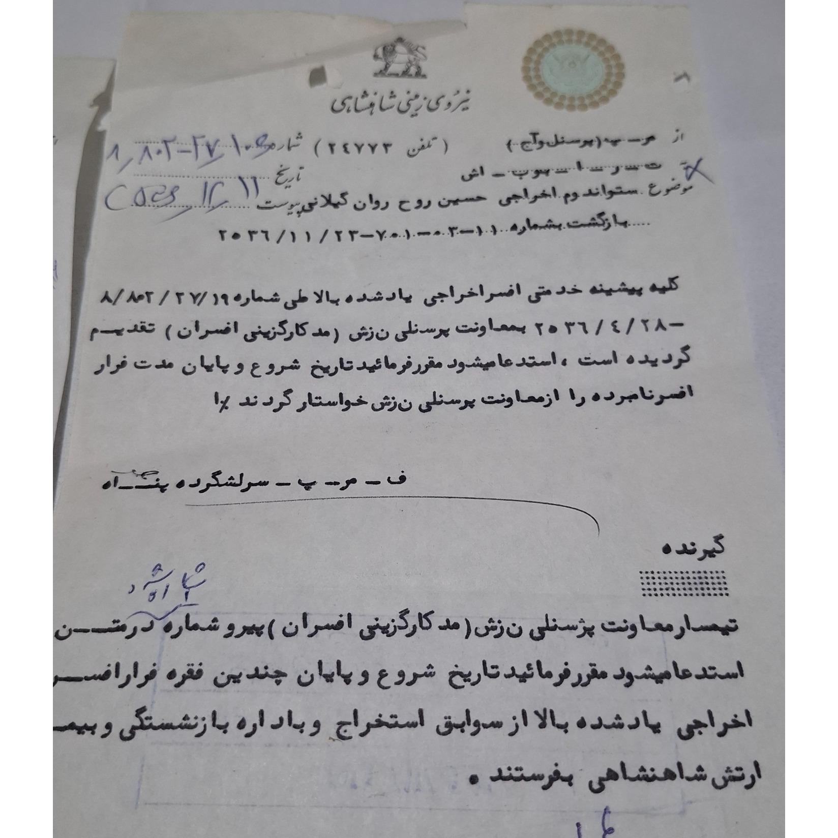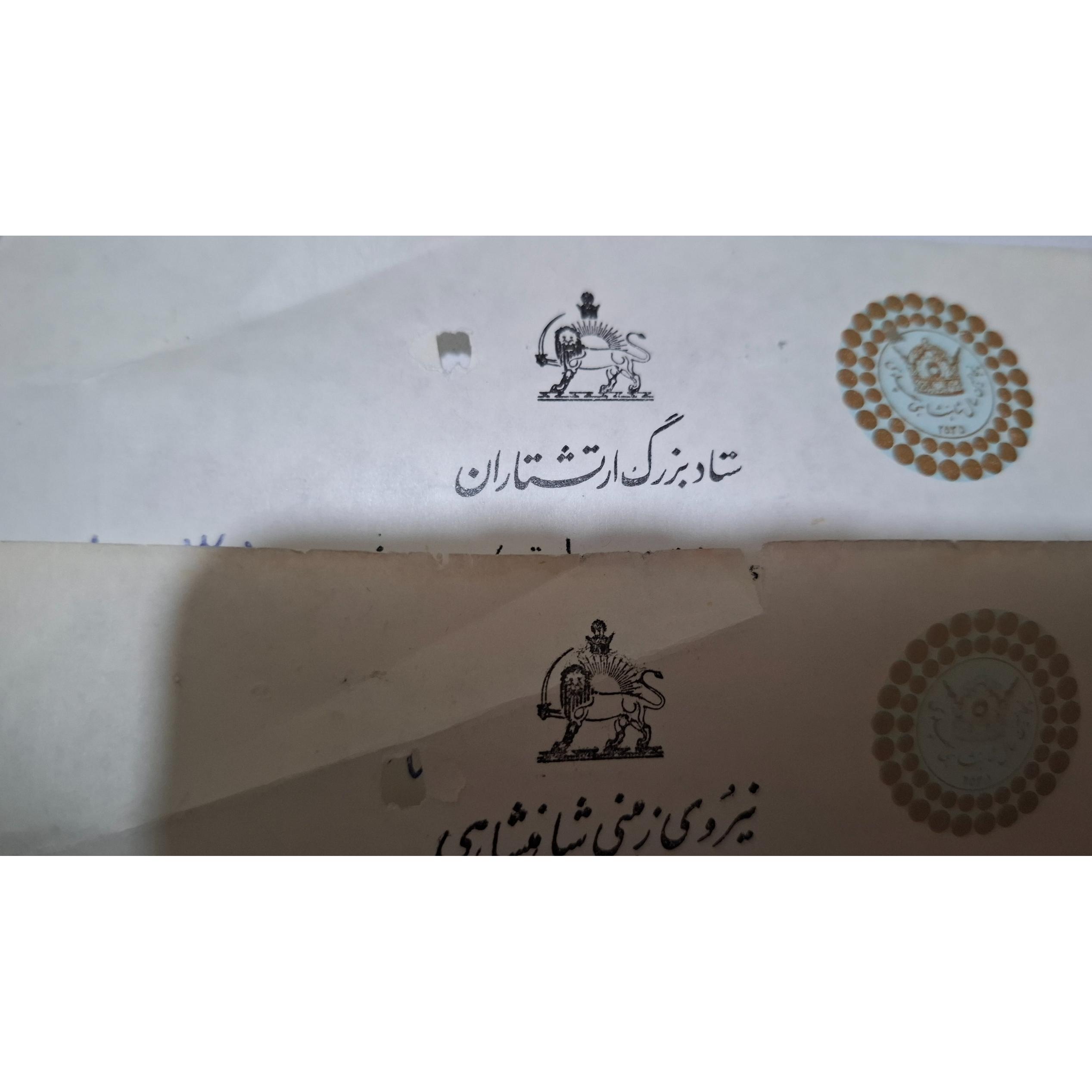 2 برگ نامه نیروی زمینی شاهنشاهی و ستاد بزرگ ارتشتاران مربوط به ستوان دوم اخراجی حسین روحروان گیلانی سال 1336 با امضا سرلشکر ده پناه و سپهبد حسین آموزگار