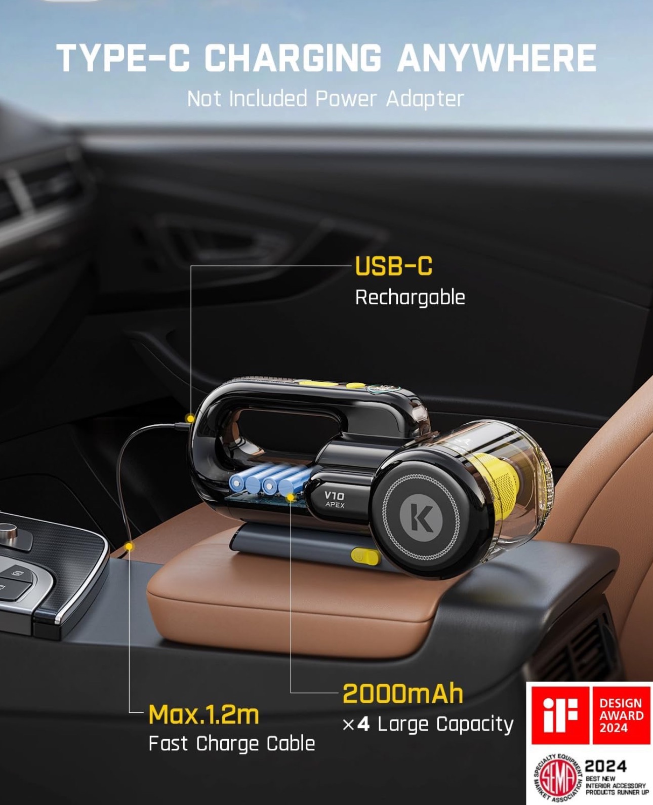 باتری قابل شارژ و شارژ Type-C: با فناوری لیتیوم یون ارتقا یافته 4*2000 میلیآمپر ساعتی، جاروبرقی بیسیم خودرو ما میتواند پس از 2.5 ساعت به طور کامل شارژ شود و در نظافت روزانه به مدت 35 دقیقه دوام بیاورد.
