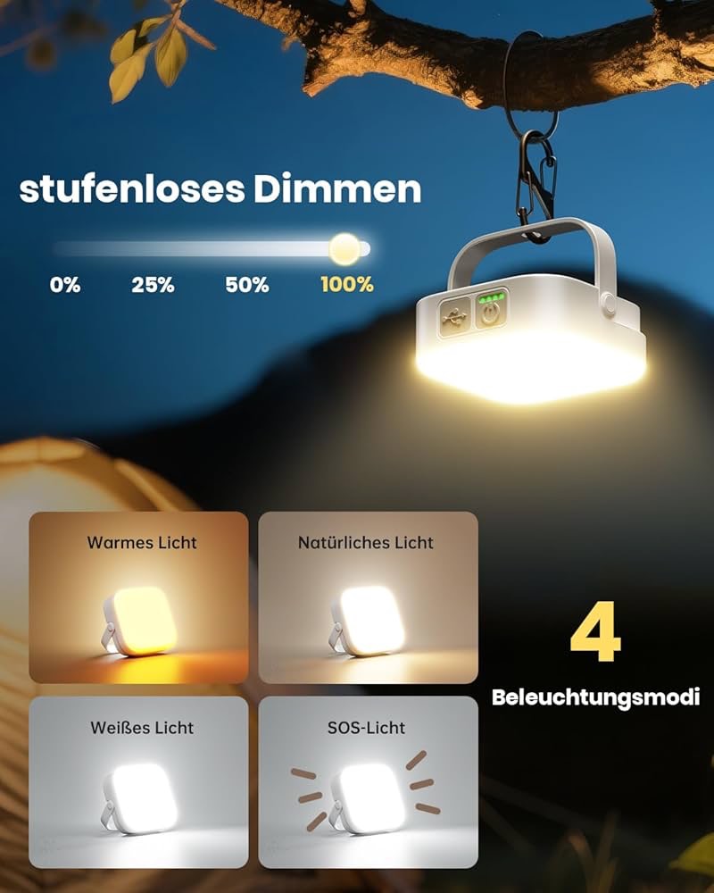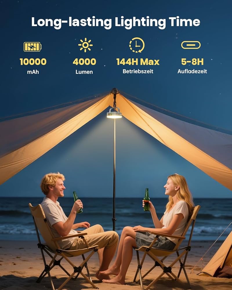 چراغهای کمپینگ خورشیدی قابل شارژ 4000 لومن: چراغ کمپینگ خورشیدی فضای باز Eventek، باتری بزرگ 10000 میلیآمپر ساعتی توکار دارد که میتواند تا 144 ساعت در روشنایی معمولی دوام بیاورد. روشنایی فوقالعاده، فضای بیشتری را در محیط تاریک روشن میکند و برای کمپینگ، پیادهروی و موارد اضطراری ایدهآل است. علاوه بر این، این چراغهای کمپینگ از خروجی USB پشتیبانی میکنند و دستگاههای تلفن همراه شما را در حال حرکت نگه میدارند - دیگر باتریها در طبیعت خالی نمیشوند.
