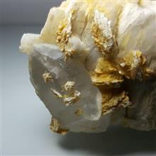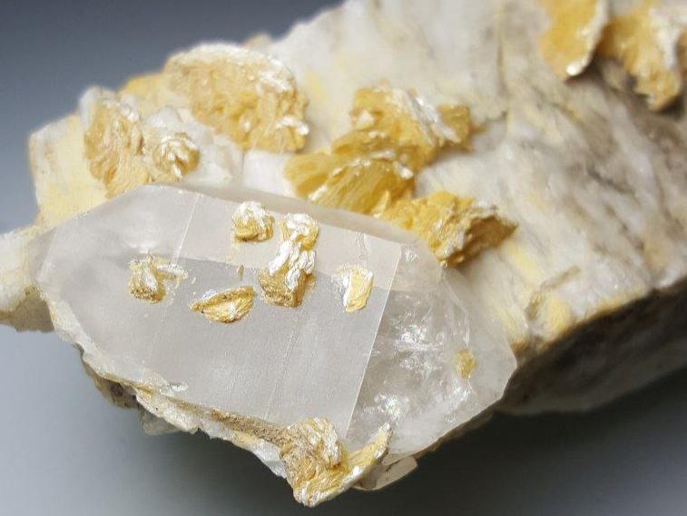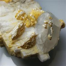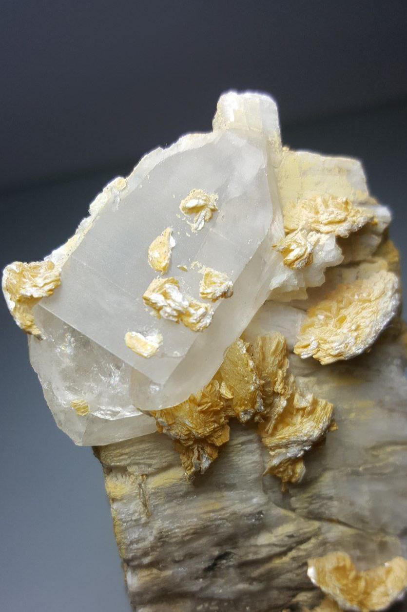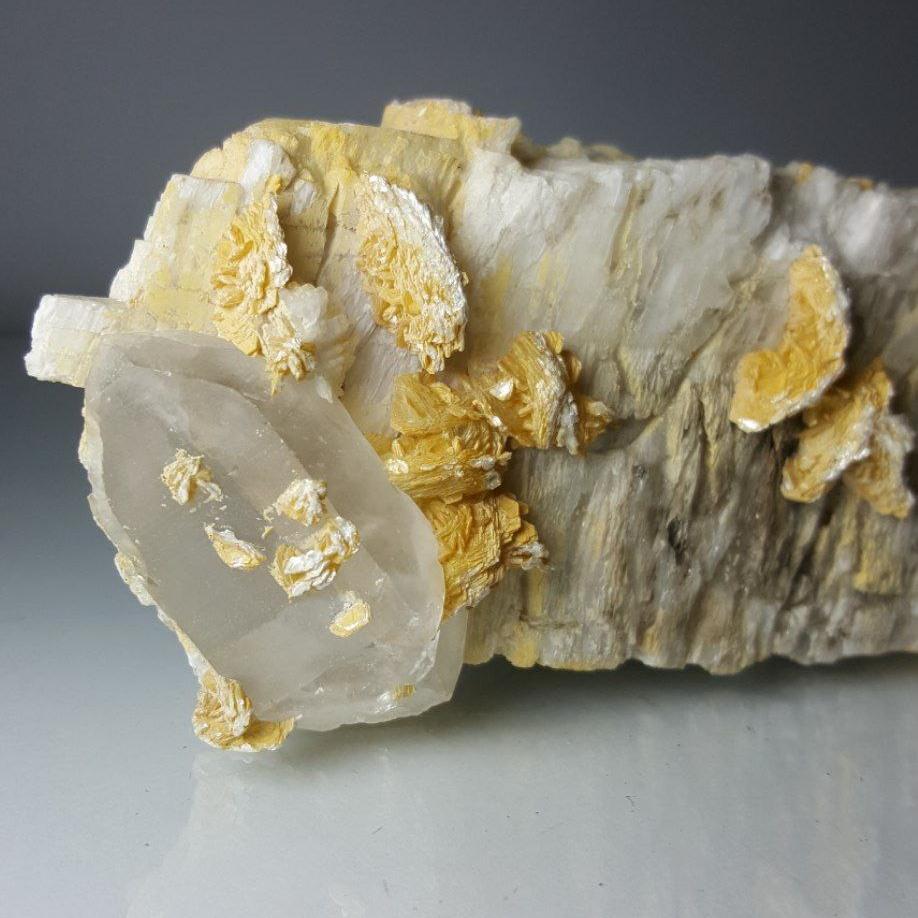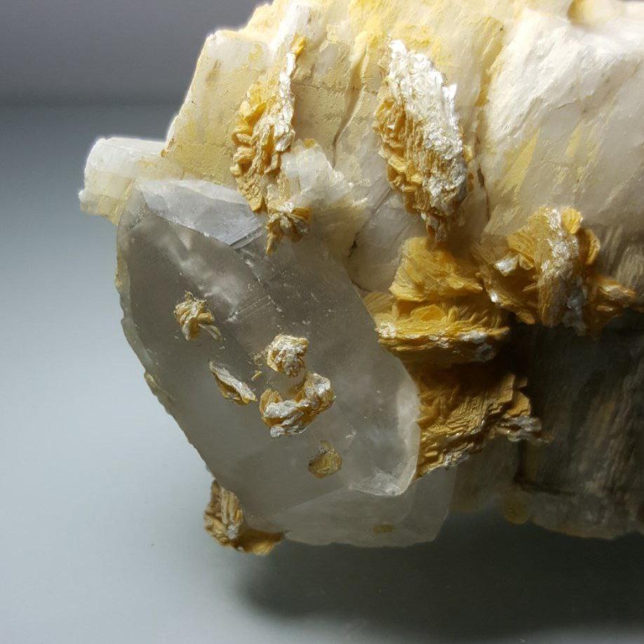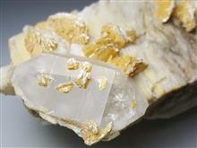 (Double terminated (dt) clear quartz on feldspat ( Var. Albite) with overgrown Mica)