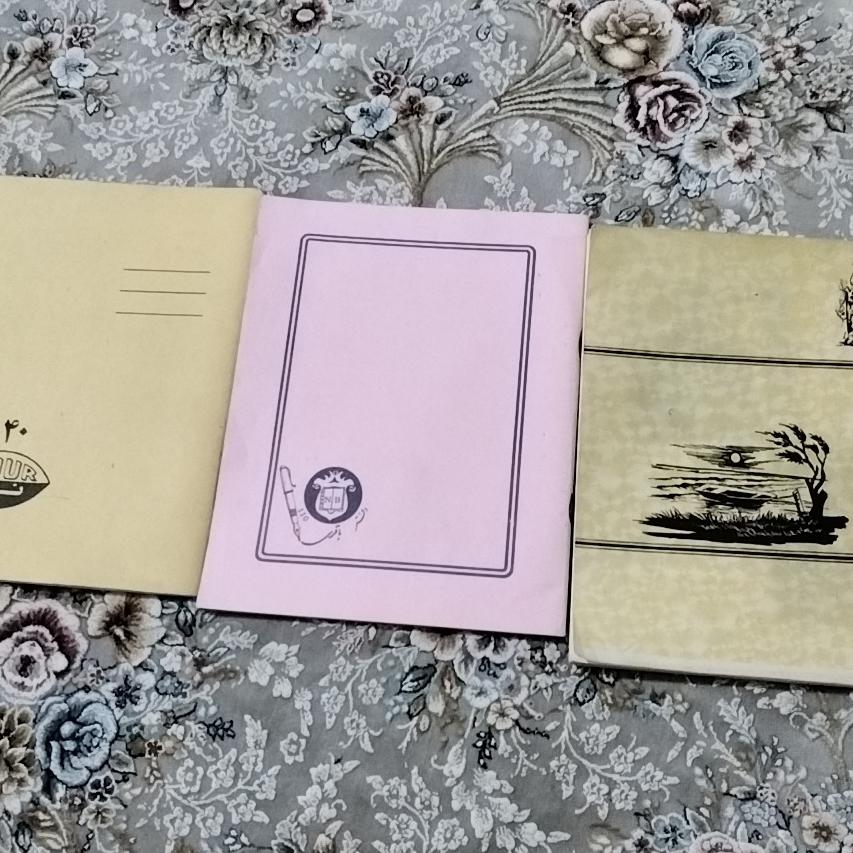 تعداد سه عدد دفتر قدیمی دهه شصد نونو دفتر 40برگ نورودفتر 40برگ باقری ودفتر خاطر انگیز شمع پروانه یادش بخیر اینها برای دهه شصدیها ارزش داره پر از خاطر هست