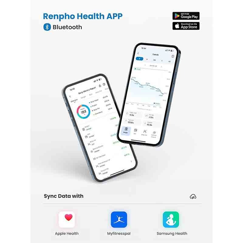 اتصال به برنامههای تناسب اندام با برنامه Renpho Health که با Samsung Health، Apple Health سازگار است و حتی برنامههای Apple Watch دارد، اهداف تناسب اندام خود را به واقعیت تبدیل کنید. با تمام دادههای جمعآوریشده از ترازو که در یک پلتفرم همگامسازی میشوند، میتوانند