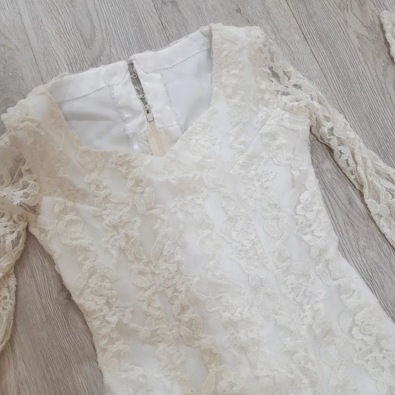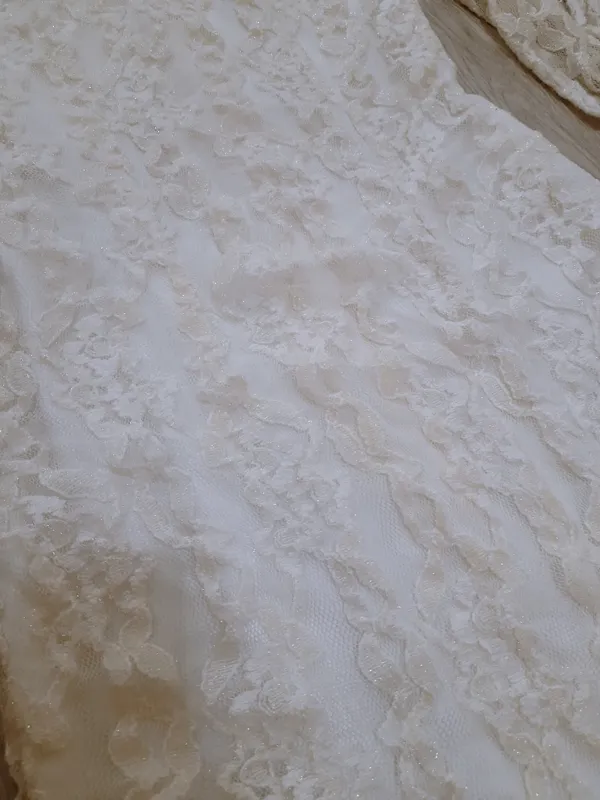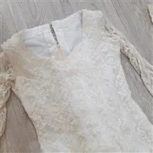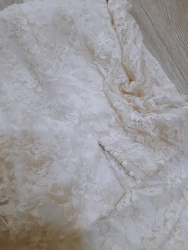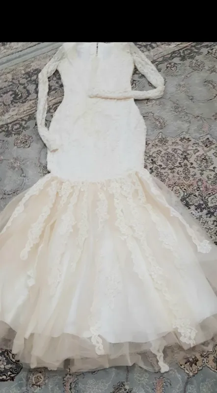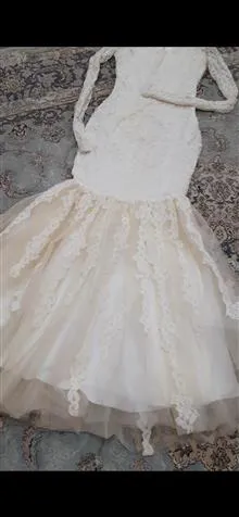 لباس از دانتل مرغوب کشی دوخته شده و تا سایز سی و هشت کش میاد، فقط یک بار تن خورده و رنگ شیری مایل به سفید هست و شاین داره از نزدیک بسیار زیباست، مناسب نامزدی و پاتختی هست