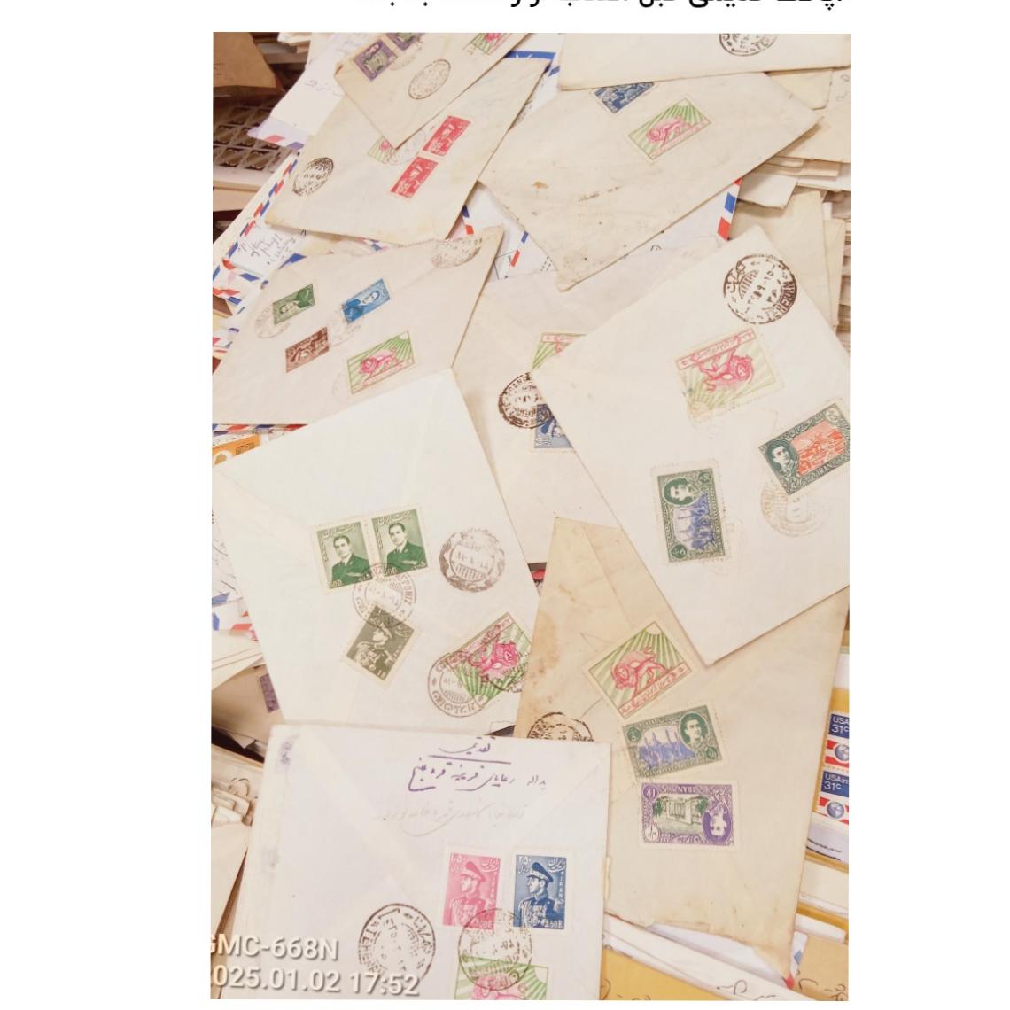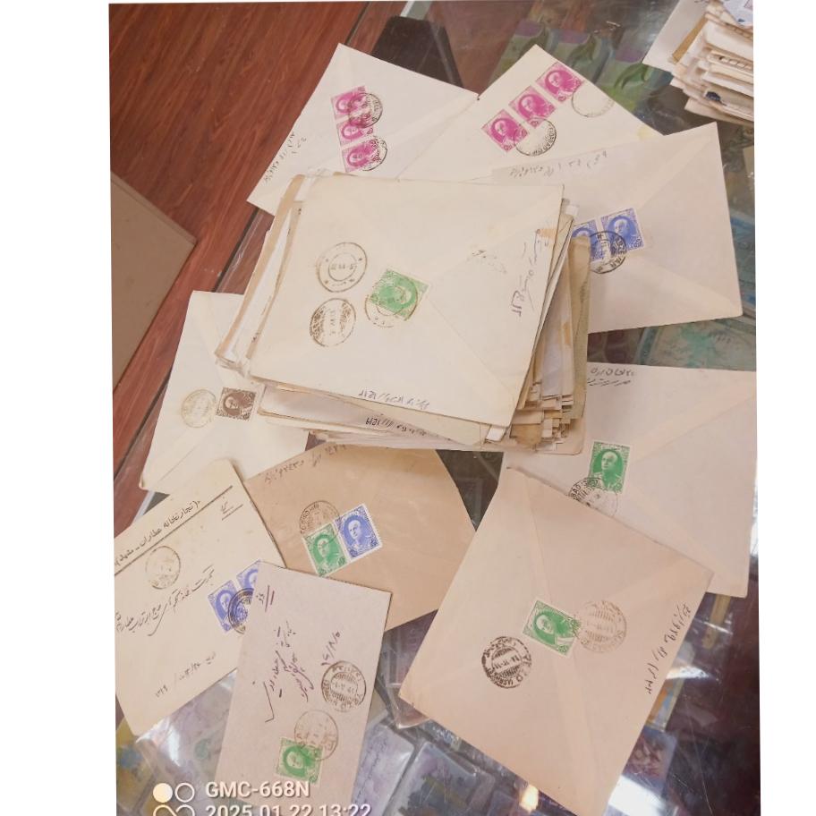 بادرود گنجینه کم نظیر از دوره رضاه شاه 150پاکت محمدرضاشاه 2550پاکت و تقریبا200تا300پاکت جمهوری اوایل انقلاب .توجه فرمایید جمهوریها اکثرا دارای نامه می باشد پهلوی دوم که شامل 400تا500آیروگرام ارسال از ایران به انگلیس و آمریکا ست که تماما نامه پشت آیروگرام نوشته شده آیروگرام های خارجی مربوط به کشور مبدا میباشد پاکتهای دوره محمدرضاشاه دارای تمبرهای پستی اول تا پستی 15اکثرا و تعدادی هم پستی 16تا19..پاکتها بدون آسیب می باشد و معیوب ها جدا شده این حجم پاکت بندرت برافروش گذاشته میشه و چندین سال زمان برده براجمع اوری ..واقعا زیبا و تاریخی تمبرهای اولیه محمدرضاشاه دراین مجموعه زیاده