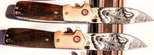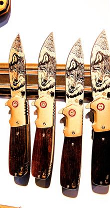 چاقوکاردشکاری اصل کلمبیا فشاری قبضه ضامن قفل دار طرح دار دسته پرنده وتیغه طرح گرگی از جنس استیل فولاد خشکه تیز و برنده تضمینی همراه کیف کمری ودرحالت باز چاقو حدود22سانت میباشد