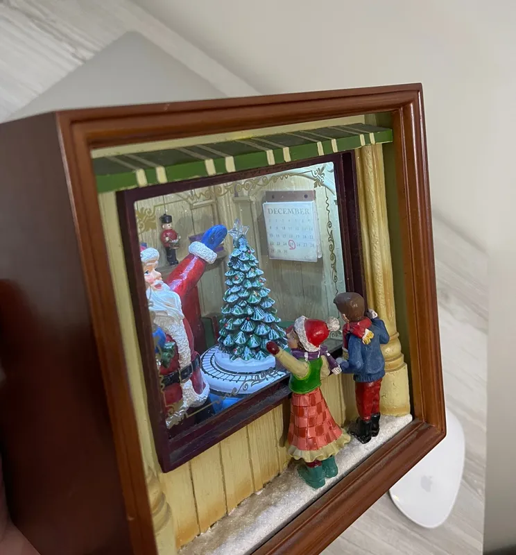 داخل جعبه یک قطار متحرک میبینید که دور درخت کریمس داخل جعبه میچرخه ،چند مدل موزیک مرتبط به کریسمس رو میزنه و چراغ داخل باکس خیلی زیبا نورش کم و زیاد میشه ،انگار شعله های شم روشن هست و حس و جلوی زیبا به کار میده ، این کار لوکس و جزییات فراوان واقعا ایران کم پیدا میشه