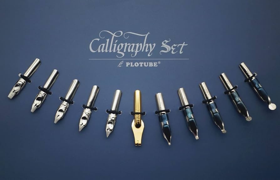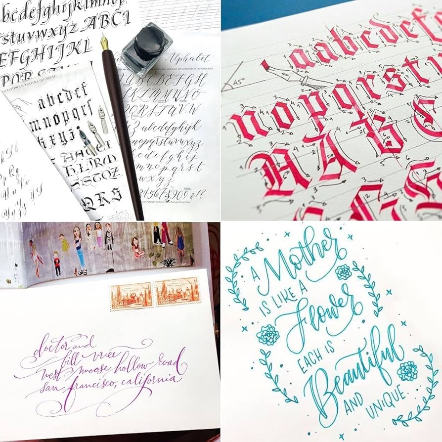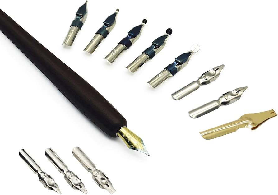 مجموعه خودکارهای خوشنویسی، 22 قطعه - شامل 7 بطری جوهر، 12 نوک، خودکار چوبی، جا خودکاری طلایی و دفترچه راهنمای مقدماتی