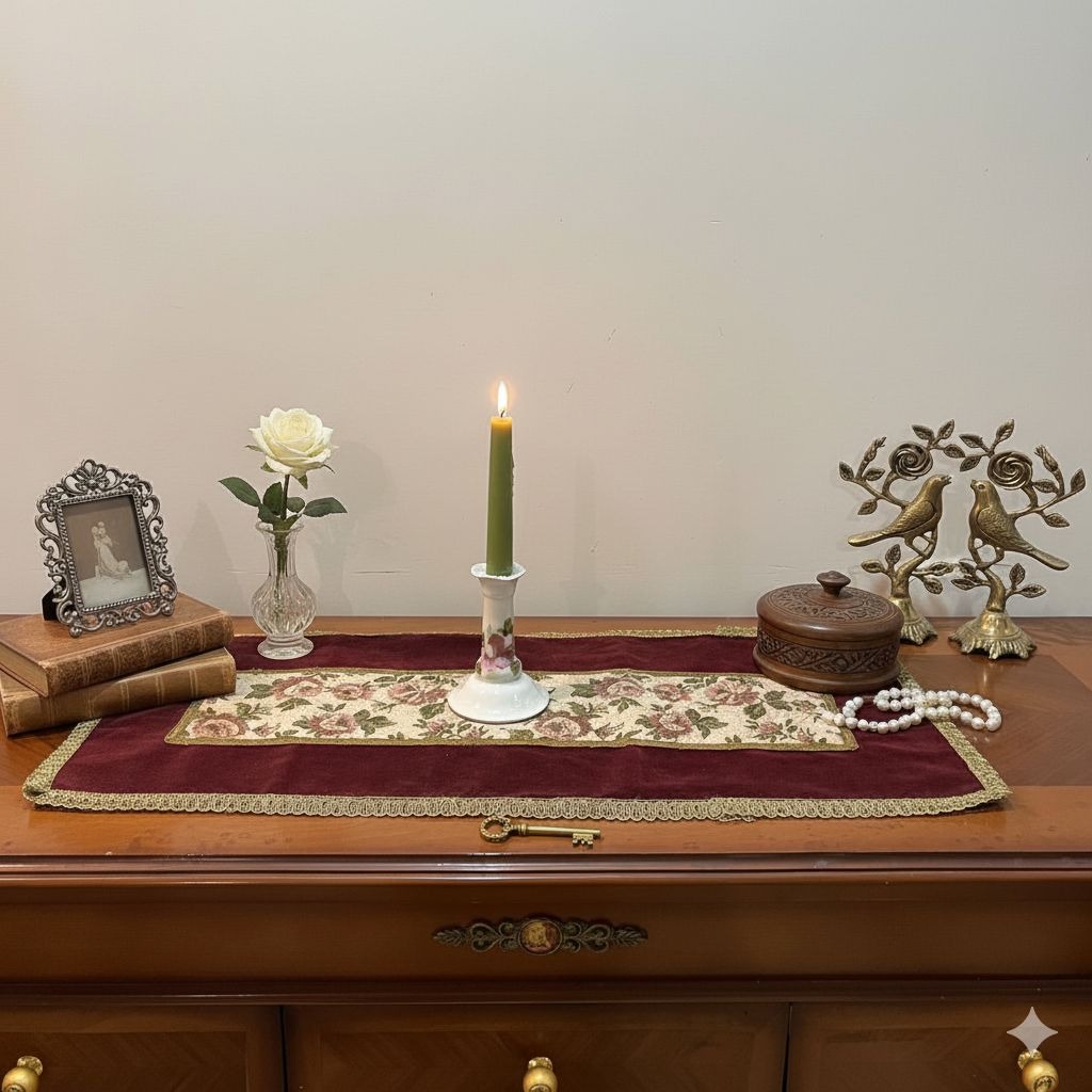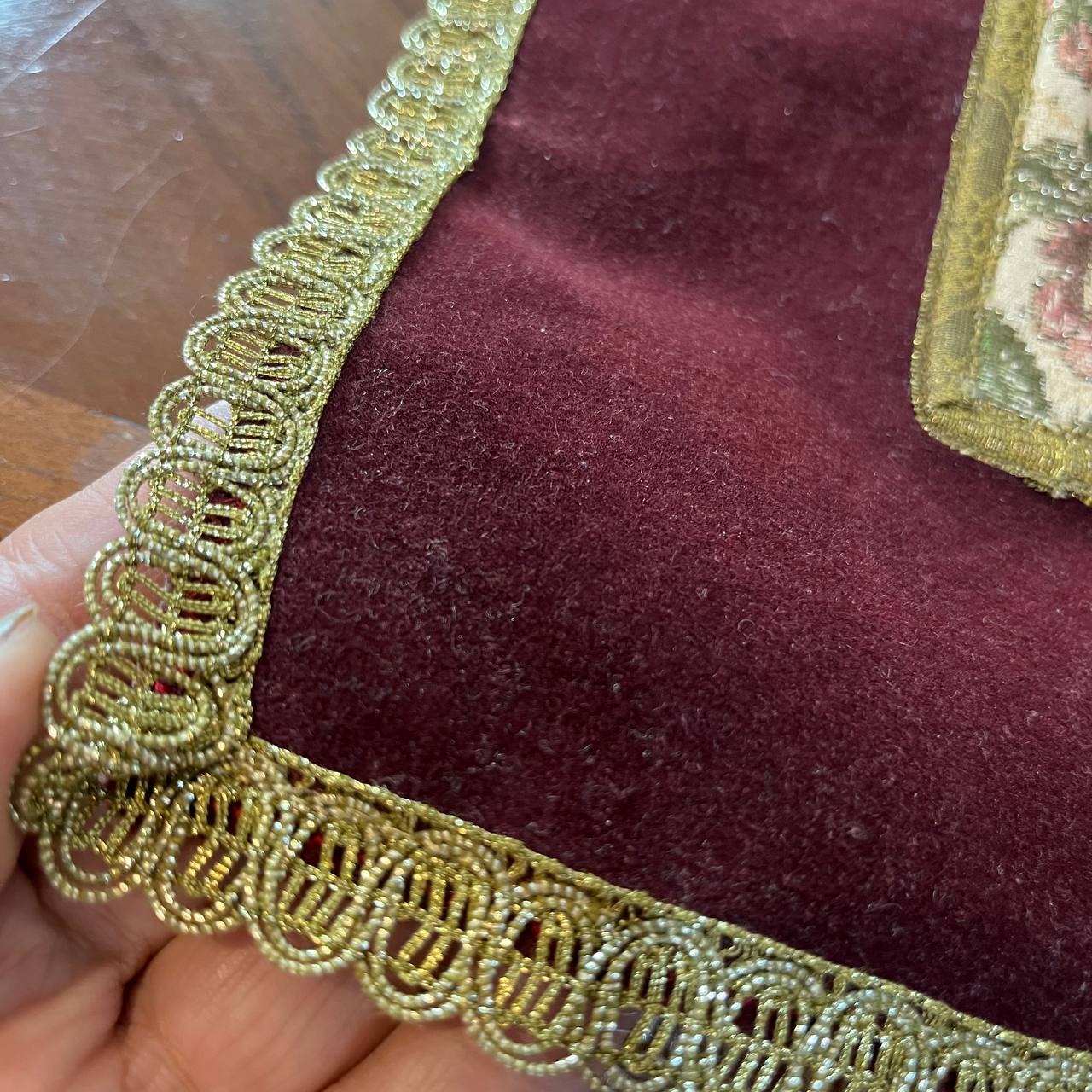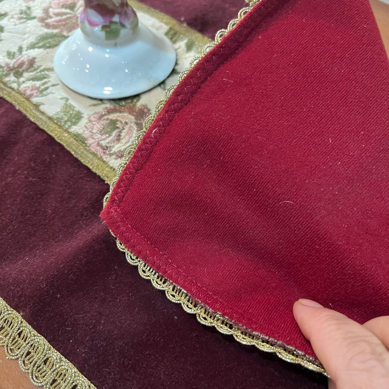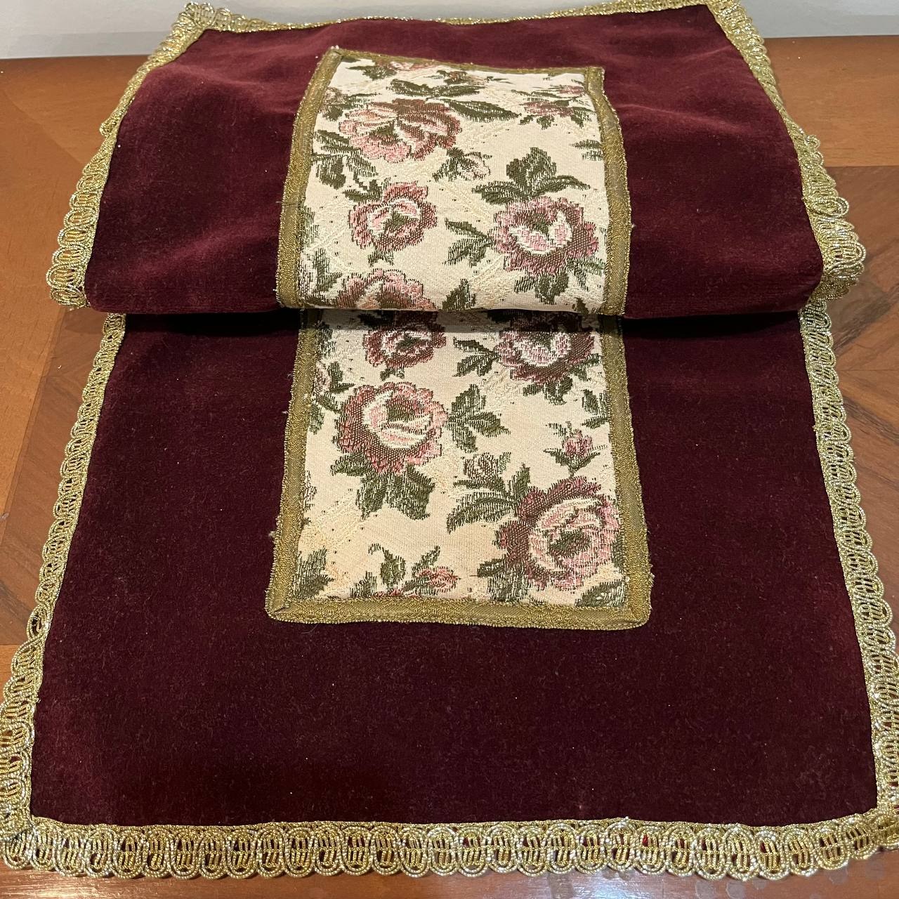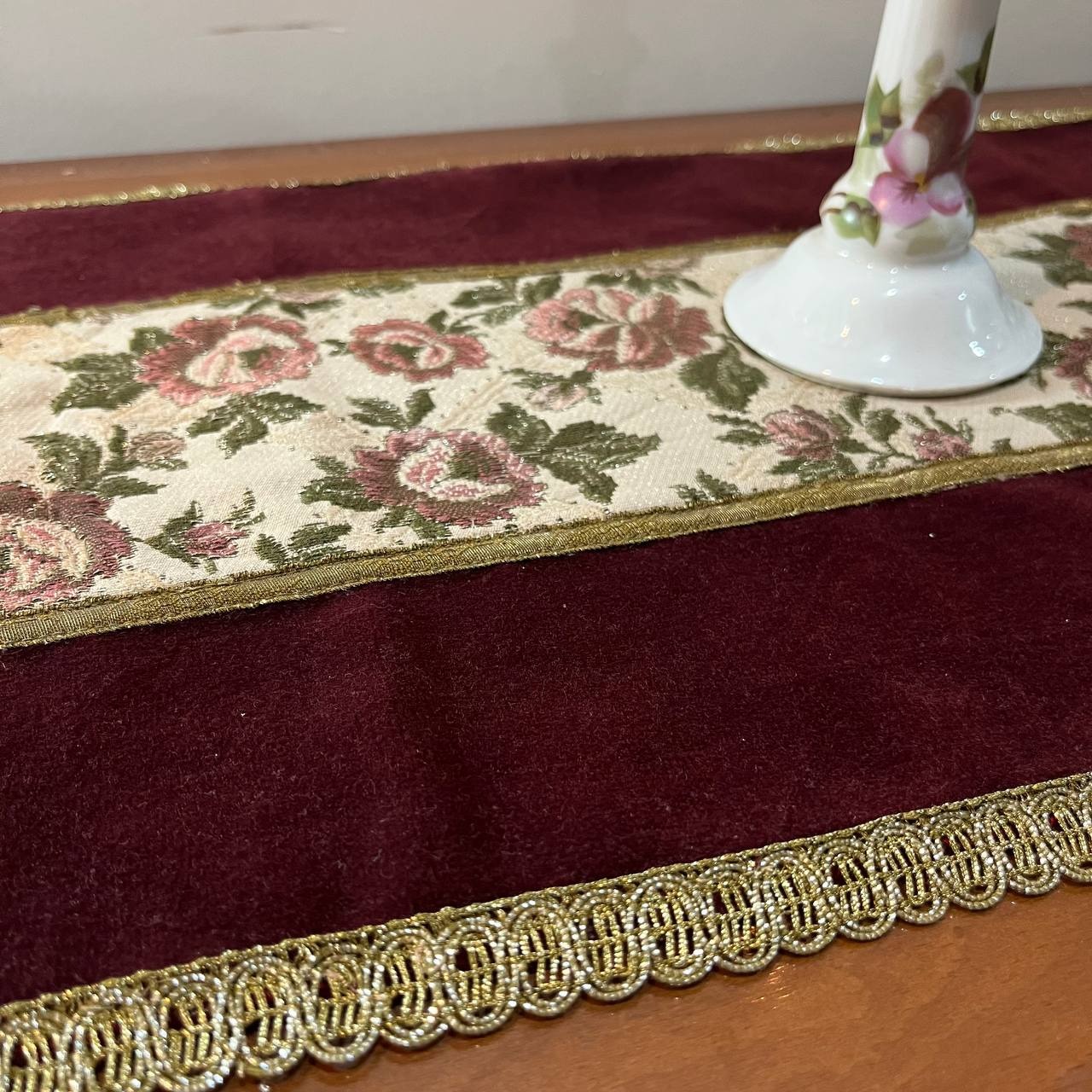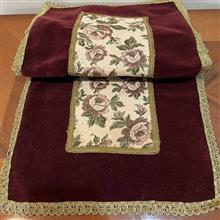 رومیزی مخمل قدیمی ترکیب مخمل ضخیم و یراقهای زیبای طلایی که گلهای رز زری دار وسطش دلبری می کنه