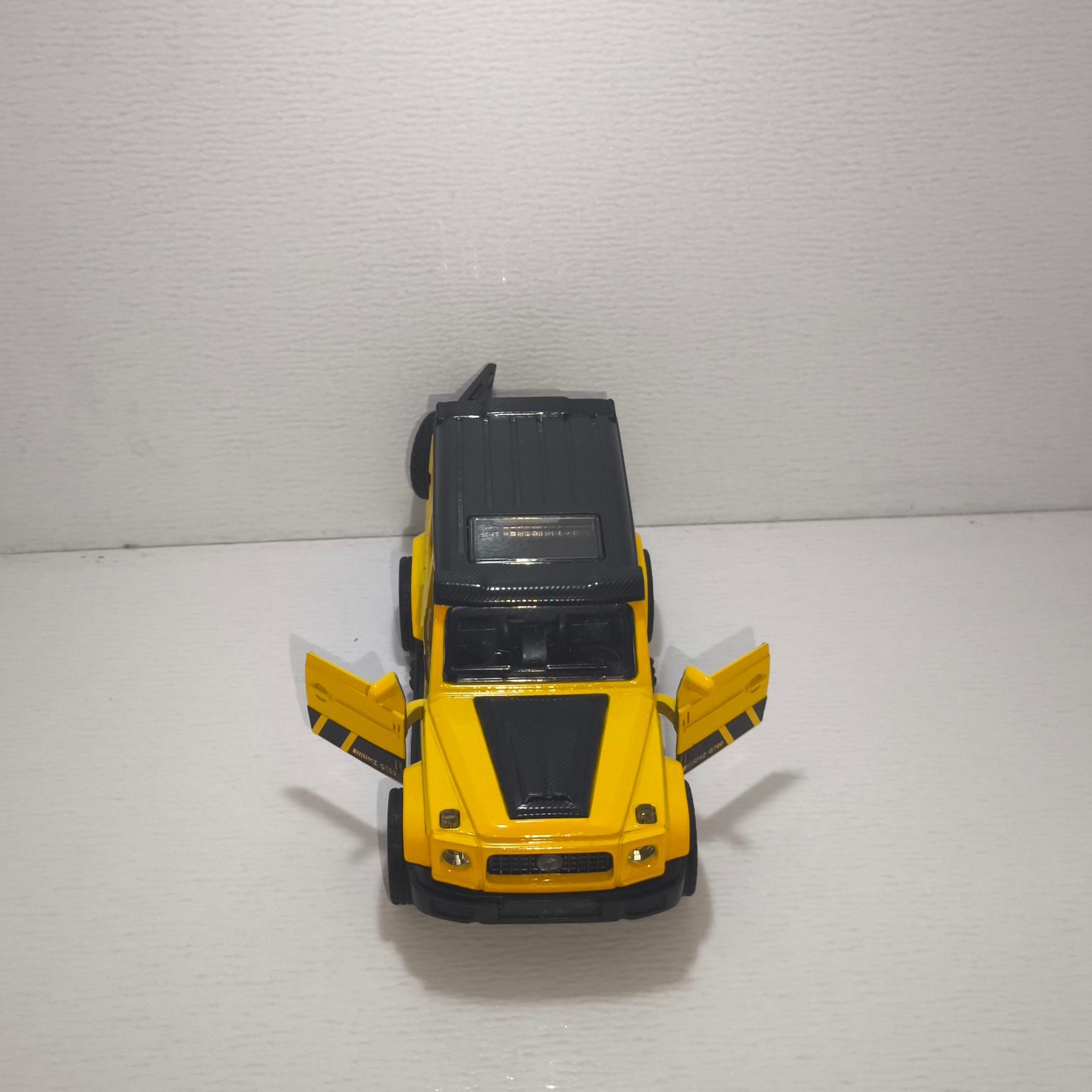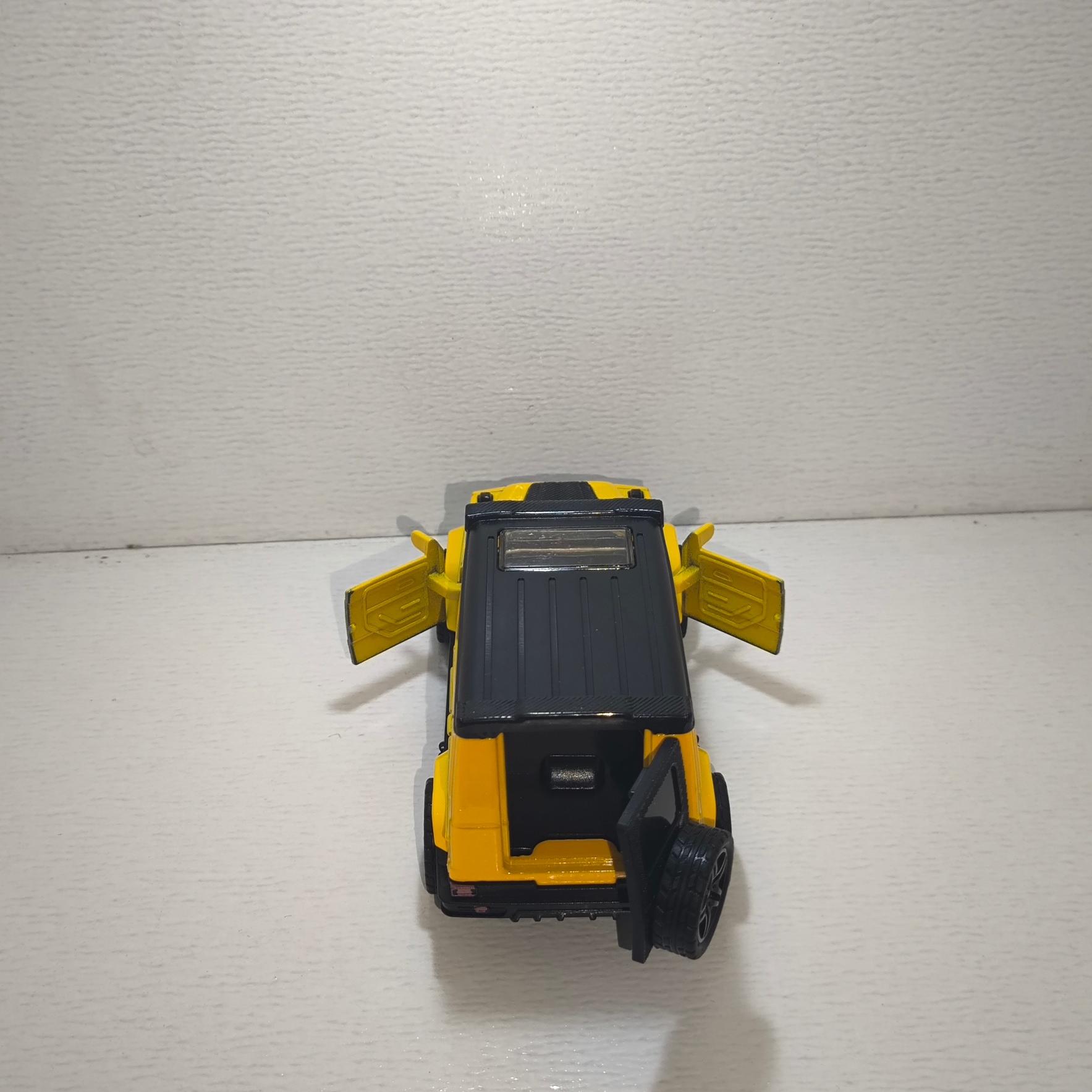 ماکت ماشین فلزی مرسدس بنز جی کلاس موزیکال و چراغدار و عقب کش قدرتی، رنگ زرد، دو درب جلو و صندوق عقب بازشو، کیفیت فوق العاده است و جزئیات داخلی ماشین به خوبی رعایت شده است.