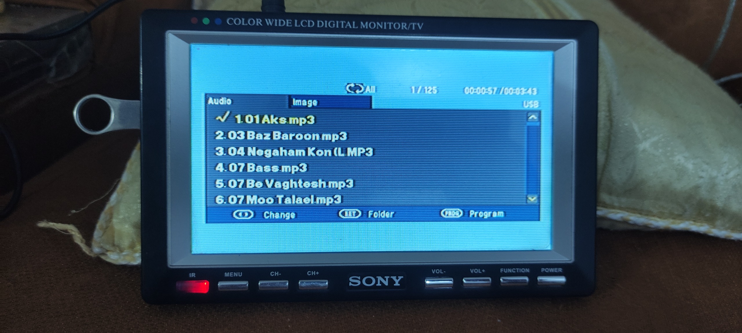 یک عدد مانیتور 7اینچ سونی با آدابتور دوازده ولت هم میشه تو ماشین استفاده کرد هم تو خونه فیلم و عکس و آهنگ هم پخش میکنه با فرمتهای که خودش گفته کنترل نداره ولی کنترل ریسه لامپ بهش میخوره فلش ورم با خشاب میخوره دوربین دنده عقب هم بهش میخوره تلویزیون آنالوگ هم هست آدابتورهم روش داره دستگاه سالمه پول لازم دارم که میفروشم