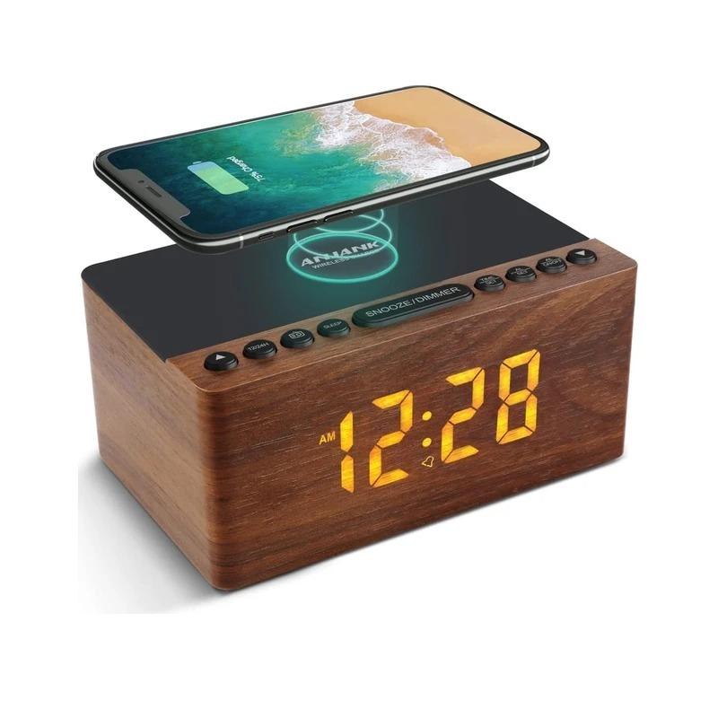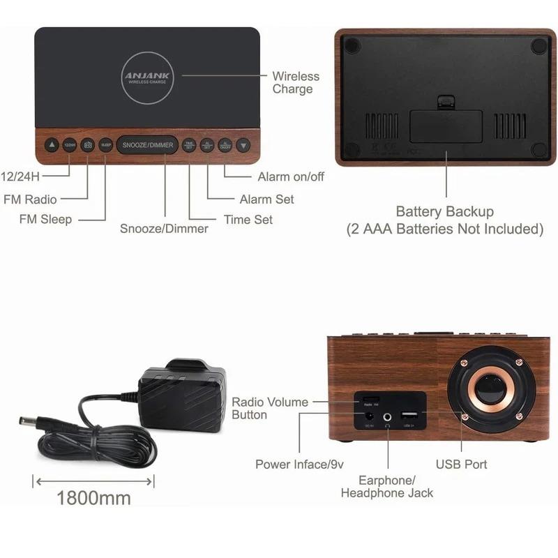 ولوم قابل تنظیم و جک هدفون: دکمه «رادیو ولوم» را در پشت ساعت بکشید تا بتوانید با صدای راحت به ایستگاه دلخواه خود گوش دهید. لطفاً، به لطف جک 3.5 میلی متری صدا، می توانید رادیو را با همراه خود به اشتراک بگذارید یا خودتان از آن لذت ببرید. طراحی ضد لغزش:طراحی شده با پد ضد لغزش، از سر خوردن تلفن همراه شما جلوگیری می کند. این ویژگی منحصر به این ساعت است! (توجه: قاب گوشی باید کمتر از 4 میلی متر باشد، در غیر این صورت راندمان شارژ گوشی تحت تاثیر قرار می گیرد) . تایمر خاموش شدن خودکار رادیو: تایمر خواب بسته به تنظیمات شما از 10 تا 120 دقیقه قابل تنظیم است، بنابراین می توانید با موسیقی مورد علاقه خود، پخش پاد و موارد دیگر به خواب بروید. توجه: آنتن سیم fm را به طور کامل گسترش دهید و جهت را برای بهترین دریافت FM تغییر دهید. کدام گوشی ها از شارژ بی سیم پشتیبانی می کنند؟ 1. iPhone 13 / iPhone 12 Pro Max / iPhone12Pro / iPhone12 / iPhone12Max / iPhone12 mini / 11 / 11 Pro / 11 Pro Max / XS Max / XS / XR / X / 8 / 8 پلاس با آخرین سیستم iOS. 2. Samsung Galaxy Note 9 / Note8 / S8 / S8 Plus / S7 / S7 Edge / S6 Edge Plus / S9 / S10 / S10 Plus / S10E / S20. 3. Google Pixel 4 / 4XL / 3 / 3XL، Google Nexus 4 / 5 / 6. LG V50 ThinQ / V50 / V40 ThinQ / V35 / V30+ / V30، LG G8 ThinQ / G8 / G7+ ThinQ /G7 ThinQ / G7 / G6+ /G6؛ 4. و سایر تلفن ها و دستگاه های دارای Qi . Clean Modern Look : طراحی مکعبی ساعت چوبی به آن یک لمس مدرن زیبا می دهد که در هر فضایی عالی به نظر می رسد. این ساعت جمع و جور باعث صرفه جویی در فضای روی میز یا پاتختی شما می شود و به خوبی آن را در دکوراسیون منزل شما جا می دهد. ایده آل برای اتاق خواب، آشپزخانه، هتل، دفتر، میز، قفسه، اتاق حدس زدن، اتاق تلویزیون، خوابگاه، رومیزی. رادیو FM و جک هدفون پشتیبانی میشود: ساعت رادیویی فضای ذخیرهسازی 30 ایستگاهی را ارائه میدهد که بدون زحمت به موسیقی مورد علاقهتان گوش میدهد. میتوانید به راحتی میزان صدا را تنظیم کنید و از طریق بلندگوهای ممتاز گوش دهید، یا میتوانید از جک 3.5 میلیمتری صدا برای تجربه گوش دادن صمیمیتر و خصوصیتر استفاده کنید. تایمر خواب قابل برنامه ریزی : این ساعت رادیویی دارای عملکرد تایمر خواب است. می توانید تایمر را بین 10-120 دقیقه تنظیم کنید تا از موسیقی، برنامه تلویزیونی، اخبار قبل از رفتن به رختخواب لذت ببرید. شارژ همزمان بیسیم و USB : با پنل بیسیم و ویژگیهای شارژ USB، میتوانید دو دستگاه دیجیتال را همزمان شارژ کنید! : از شارژ تطبیقی 5W/7.5W/10W پشتیبانی می کند که می تواند گوشی هوشمند شما را به سرعت و به راحتی شارژ کند. دیگر هیچ مشکلی با کابلها یا ساعتهای انتظار برای شارژ گوشی خود ندارید. همچنین دارای یک پورت USB اضافی برای شارژ سایر دستگاههای الکترونیکی مانند تلفن دوم، پاوربانک یا ساعت هوشمند است. & : رادیو، دکمه رادیو را به مدت سه ثانیه فشار دهید و نگه دارید، می توانید به راحتی ایستگاه های رادیویی مورد علاقه خود را تنظیم و ذخیره کنید. با یک بلندگوی تنظیم صدا درجه یک، می توانید از صدای واضح و بکر لذت ببرید. همچنین یک تایمر خواب از 10 تا 120 دقیقه وجود دارد. یک گزینه اضافی مفید. : این صفحه نمایش بزرگ LED دیدن آن را حتی در اتاق خواب، اتاق نشیمن، آشپزخانه، دفتر آسان می کند، بنابراین برای افراد ضعیف بسیار عالی است. با صفحه نمایش LED قابل تنظیم 5 سطح می توانید روشنایی کامل را پیدا کنید و از نورهای روشن در طول شب اجتناب کنید - : دکمه SNOOZE را فشار دهید و از 9 دقیقه خواب اضافی لذت خواهید برد. دکمه SNOOZE برای جستجوی آسان بدون باز کردن چشمانتان بزرگ طراحی شده است. & :به راحتی با دکمه های بالا ست می شود. ANJANK یک سیاست بازگشت 30 روزه و خدمات پس از فروش 24 ساعته را وعده می دهد.