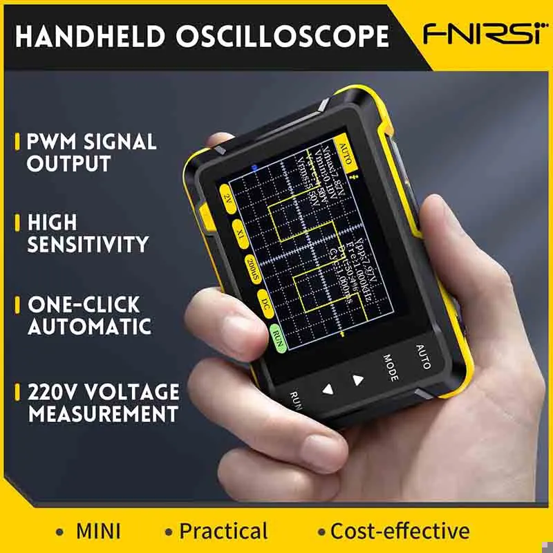 مینی اسیلوسکوپ FNIRSI DSO152 دارای امتیاز نمونه برداری بلادرنگ 2.5 MS/s و پهنای باند 200 کیلوهرتز است. پروب 10 x میتواند تا 800 VPP را اندازهگیری کند که معادل 280 ولت AC است. ولتاژها تا 400 ولت قابل اندازه گیری هستند.