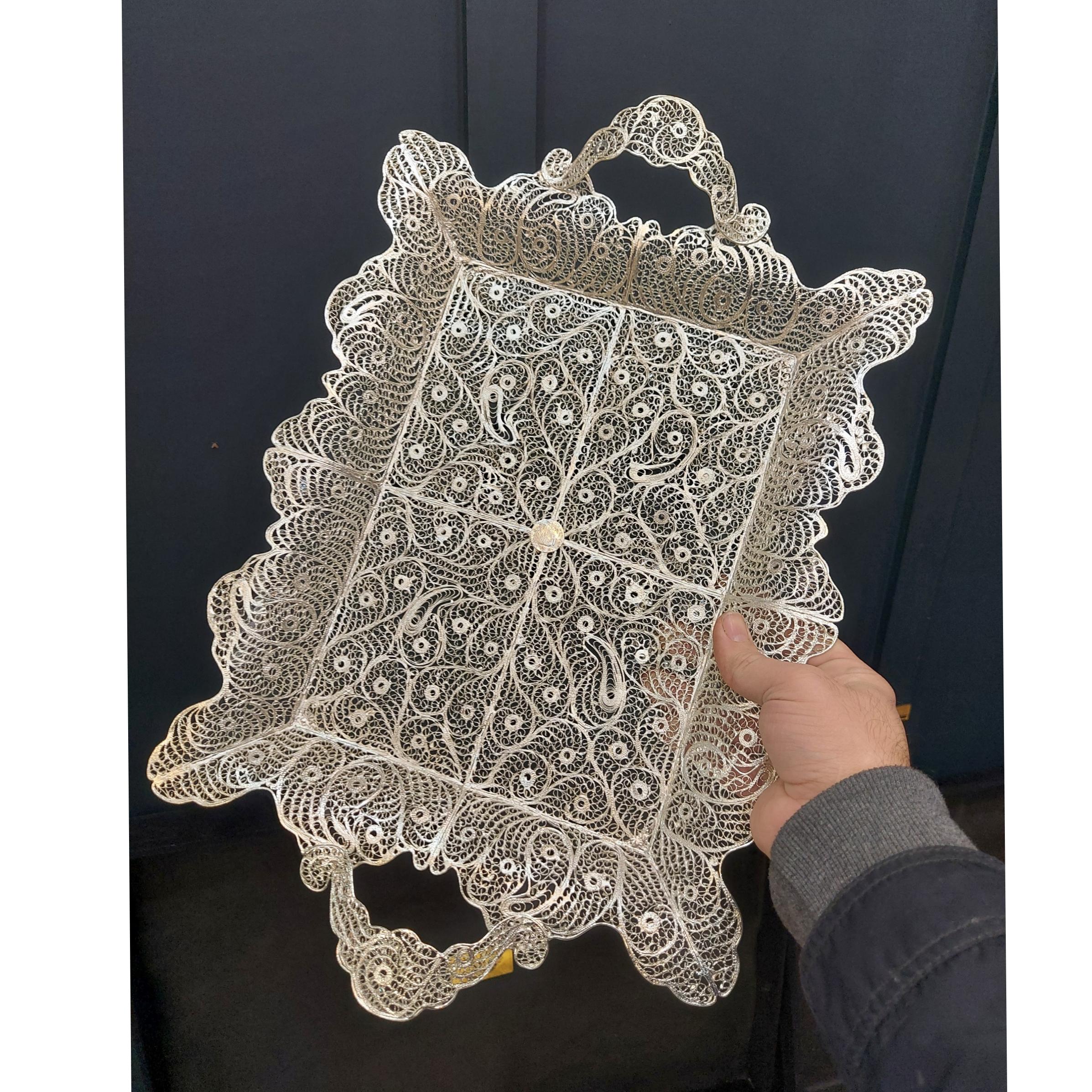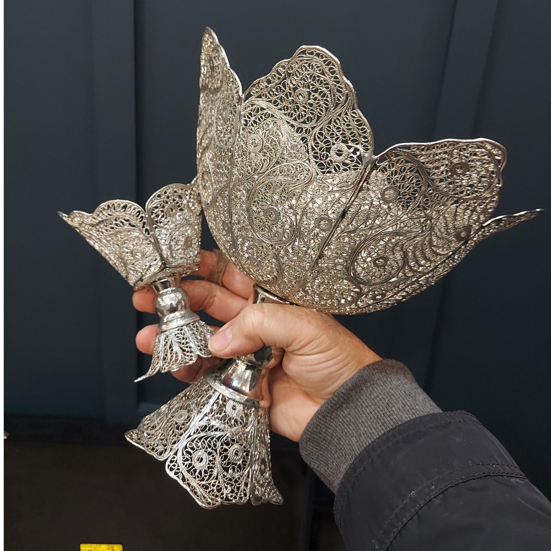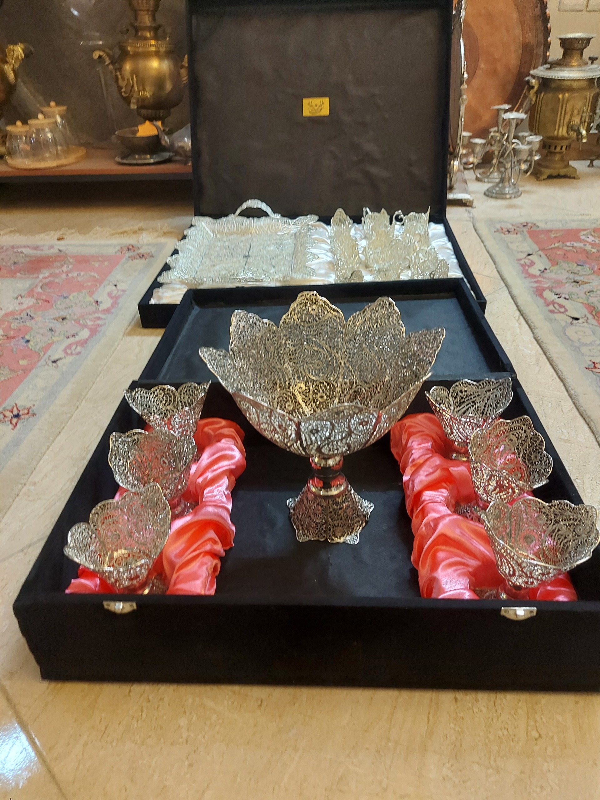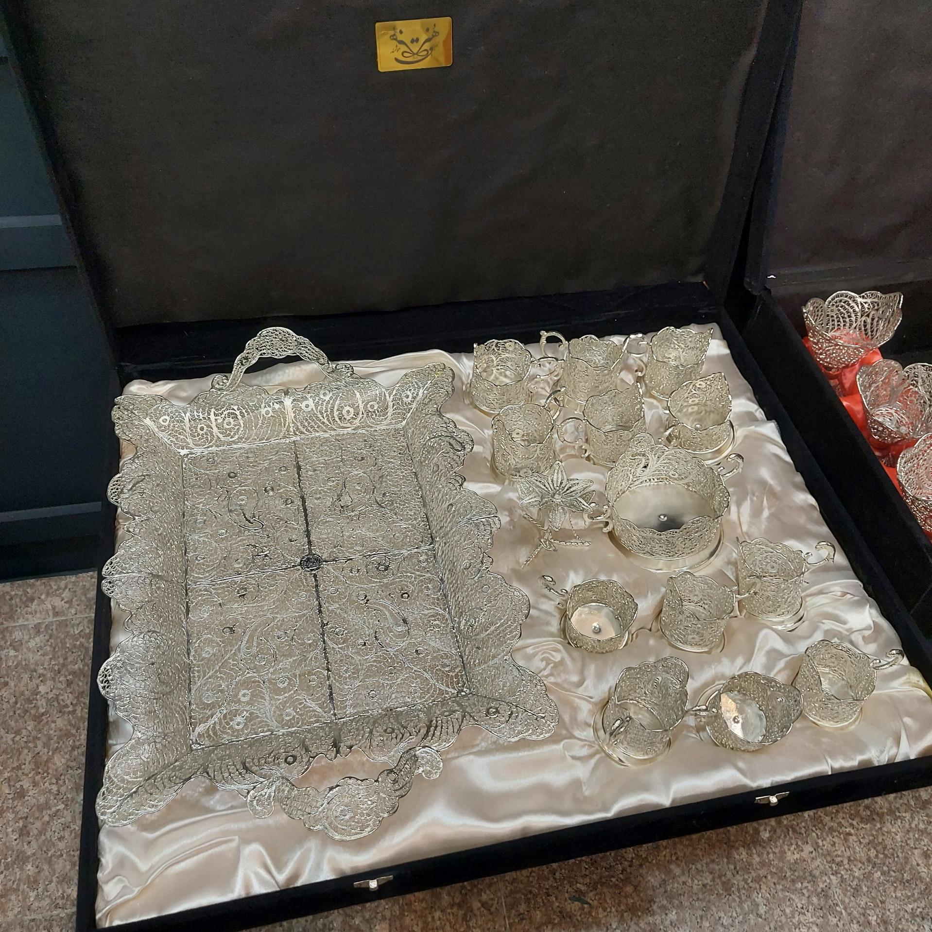 کاملا نو استفاده نشده با آب نقره سنگین مارک دار به همراه جعبه فابریک بدون کسری 6 عدد انگاره استکانی 6 عدد انگاره لیوانی یک عد. سینی پذیرایی 1 عدد قندان 1 عدد گل تزئینی فابریک مجموعه یک عدد کاسه پایه دار آجین 6 عدد آجیل خوری همگی ملیله دست،
