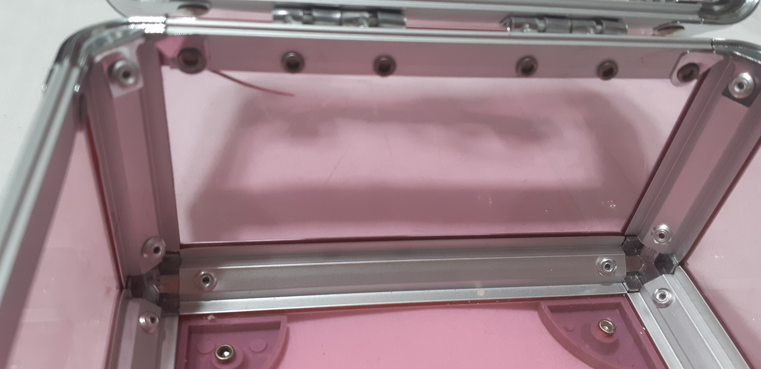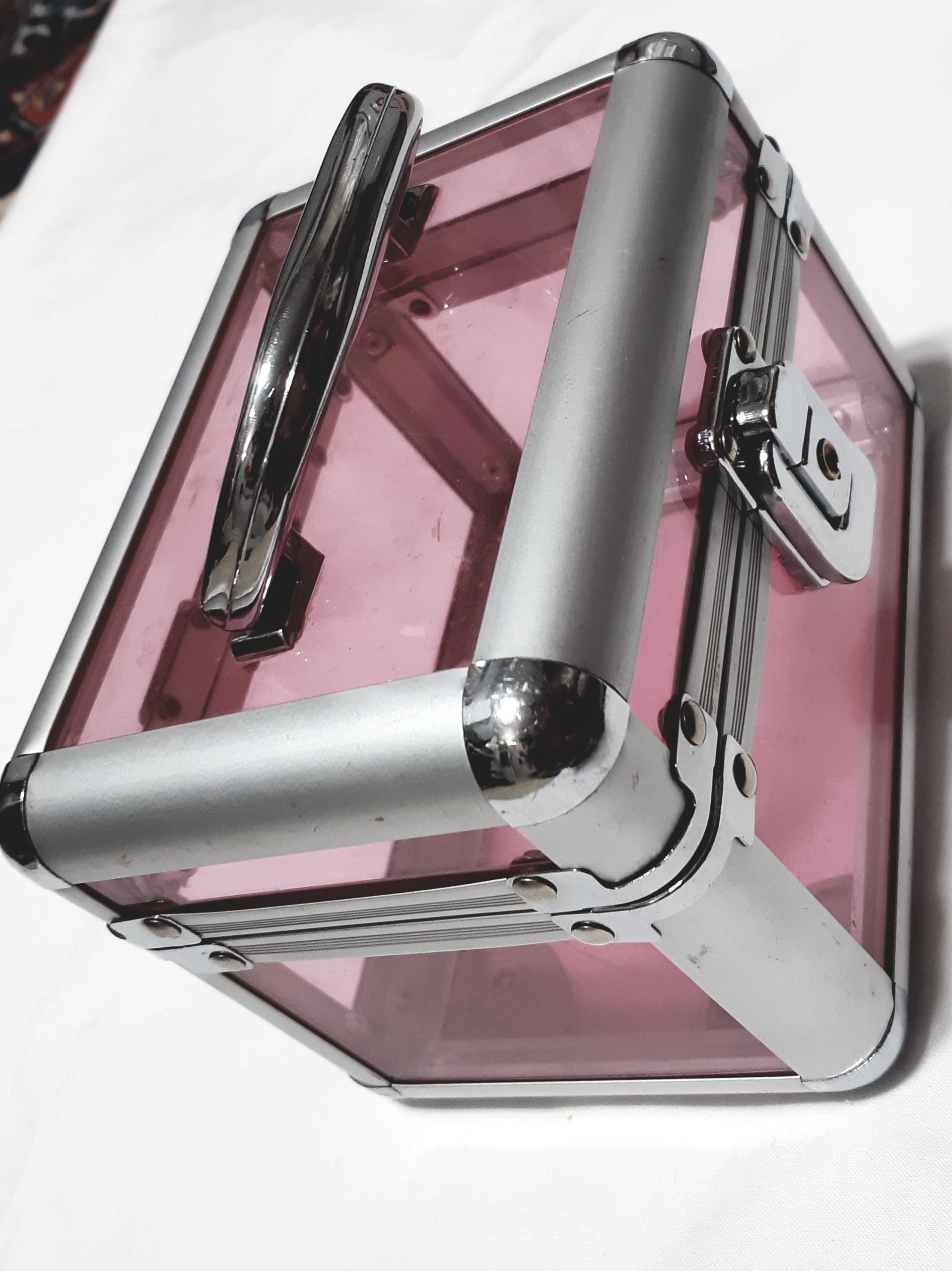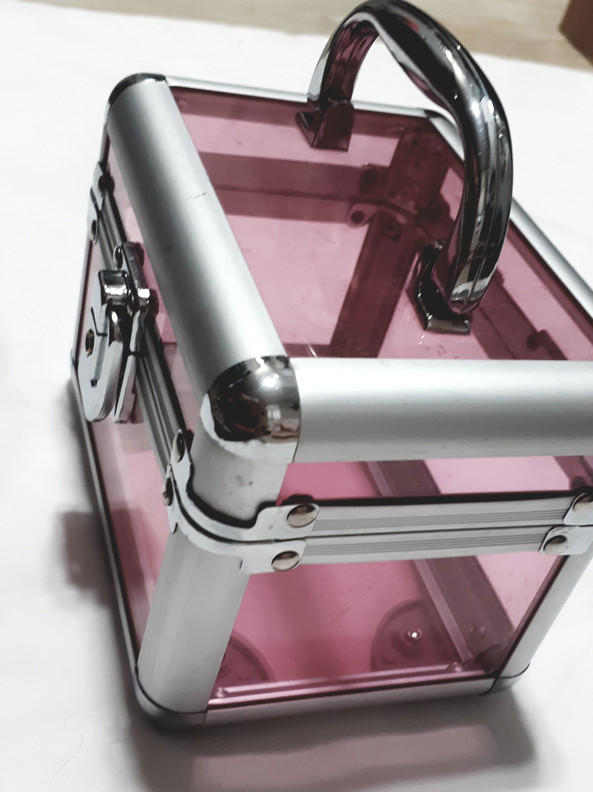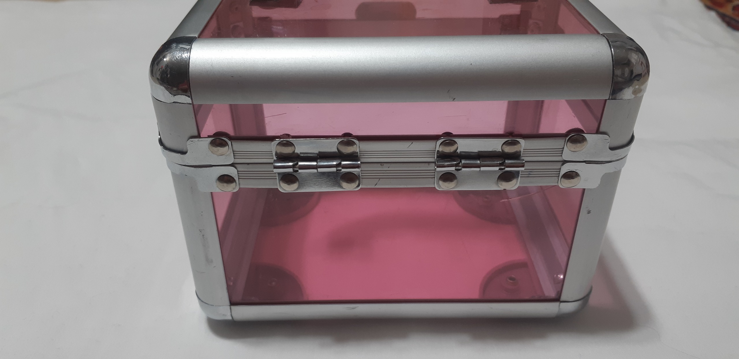 صندوقچه قدیمی زیبا دونه تلفیقی از آلومینیوم و تلق قدمت محصول بالای 20 سال است و کمی خط و خش و یک ترک جزئی دارد قفل هم نمیشود انا راحت باز و بسته میشود