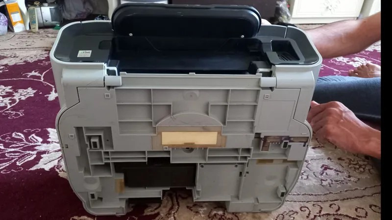 روی درب و بدنه اسکنر رد سوختگی هست، بعنی یک جسم داغ افتاد بالای پرینتر، تو عکس مشخصه.