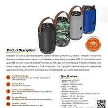 اسپیکر بلوتوث BTS103 از دیگر محصولاتی است که به تازگی توسط کمپانی انرجایزر به بازار عرضه شده است. این اسپیکر بلوتوث که به صورت یک استوانه طراحی شده است از همین دست اسپیکرها است. طراحان این مدل هم زمان راحتی کاربری و زیبایی را در آن پیاده کرده اند در راستای بالا بردن رابط کاربری محصول با قرار دادن یک بند چرم به فکر راحتی حمل و نقل آن بوده اند. همچنین مدل ایستاده آن باعث میشود این محصول هنگامی که بر روی میز قرار میگیرد، جای کمی بگیرد. بر روی اسپیکر یک روکش پارچهای با تنوع رنگی بالا و طرح خاص ارتشی با الهام از طبیعت و جنگل استفاده شده است. در قسمت انتهایی آن روکش فلزی استفاده شده است تا آسیبی به اسپیکر وارد نشود همینطور دکمههای کم و زیاد و جستجو و پاور در قسمت جلویی این بخش و پورت های USB ،AUX و ورودی کارت میکرو و درگاه شارژ MicroUSB در قسمت پشتی آن است. کمپانی انرجایزر در استفاده از این محصول کاملا دست شما را باز گذاشته اند و با ایجاد تمامی امکانات در آن تلاش نمودهاند تا محصولی زیبا و بینقص را به بازار عرضه دارند.