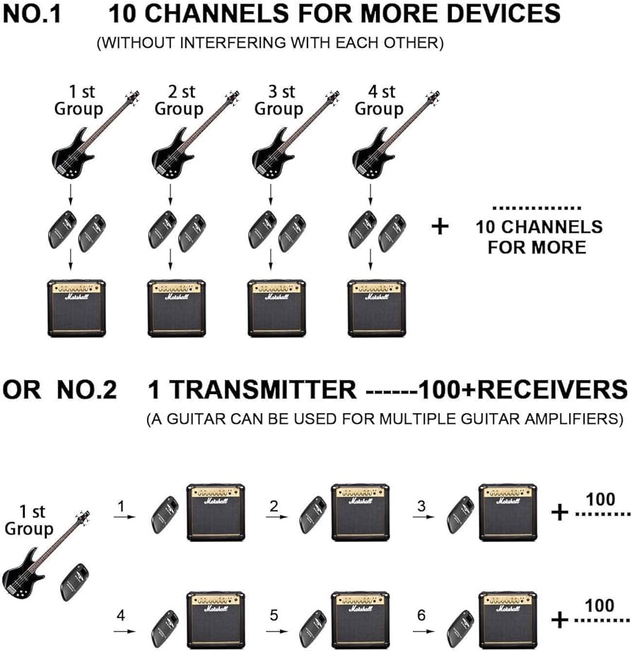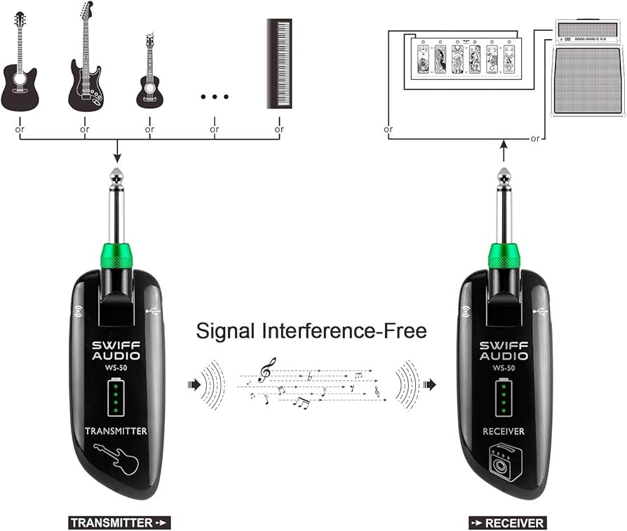 SWIFF - فرستنده گیتار الکترونیکی با کیفیت بالا با سیستم بیسیم قابل شارژ برای گیتار، کانالهای متعدد و 5.5 ساعت عمر باتری برای همه سازهای موسیقی الکتریکی