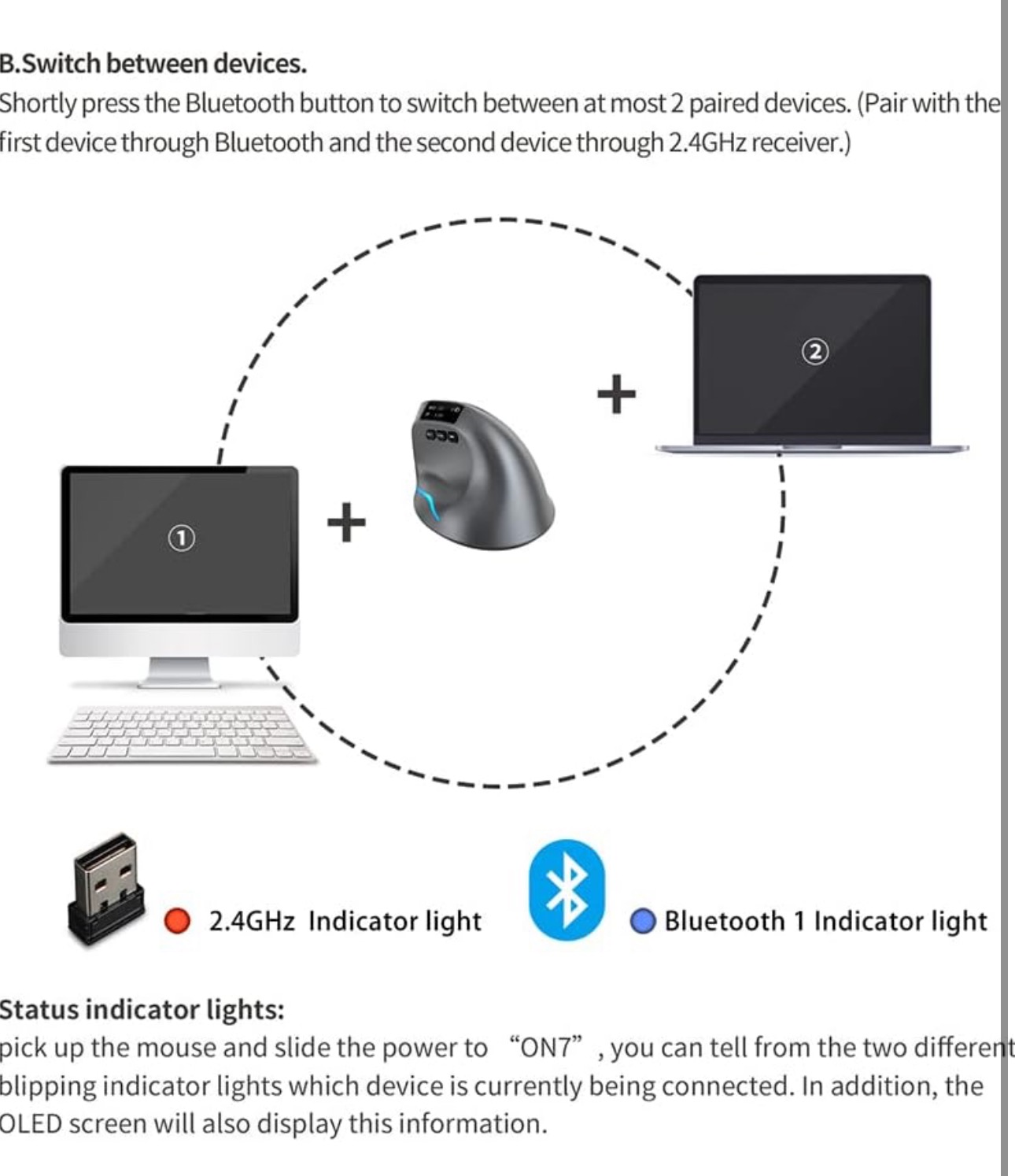 دو حالت اتصال بیسیم این ماوس بیسیم دو حالت اتصال ارائه میدهد: حالت بیسیم USB 2.4G و حالت بلوتوث. این ماوس میتواند با اتصال گیرنده به پورت USB دستگاه شما یا از طریق بلوتوث (دستگاه باید قابلیت بلوتوث داشته باشد) متصل شود. میتواند به طور همزمان به دو دستگاه متصل شود و آزادانه بین آنها جابجا شود. به عنوان مثال، میتوانید به راحتی و به سرعت کنترل ماوس را از رایانه شخصی به لپتاپ، تبلت و غیره تغییر دهید.