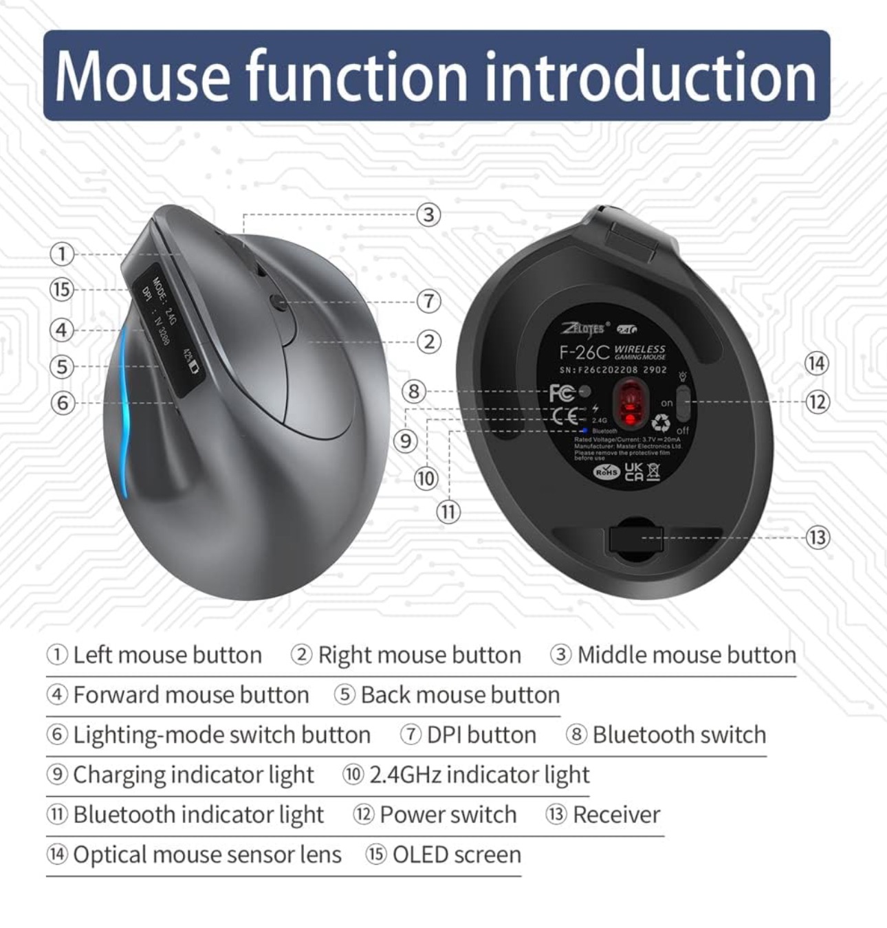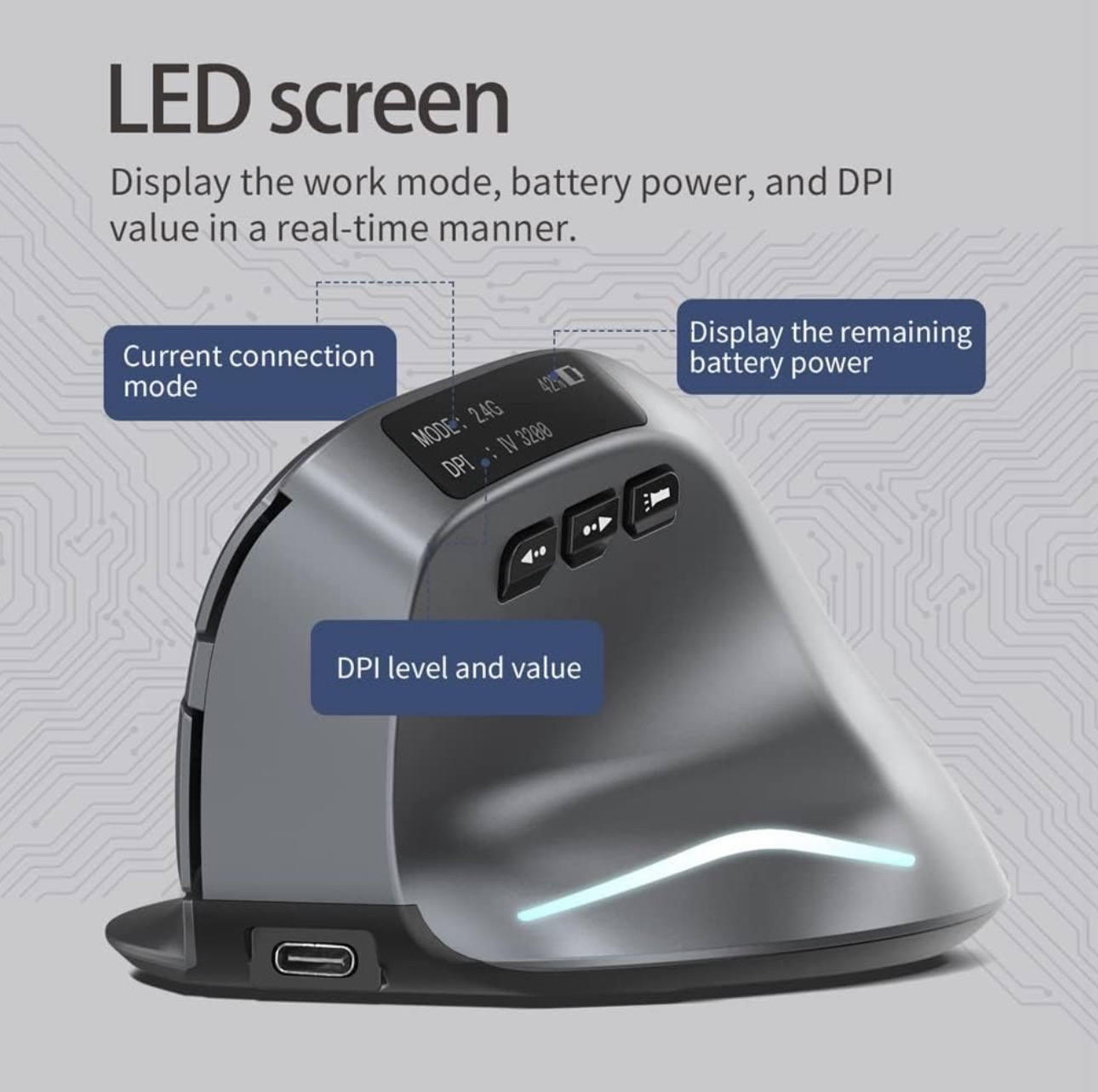 ماوس بیسیم بلوتوث zelotes با صفحه نمایش، قابل شارژ، 3200DPI، بلوتوث 5.0/3.0 و 2.4G، 7 دکمه، LED، USB، ماوس ارگونومیک عمودی اپتیکال برای لپتاپ، کامپیوتر، تبلت، مشکی