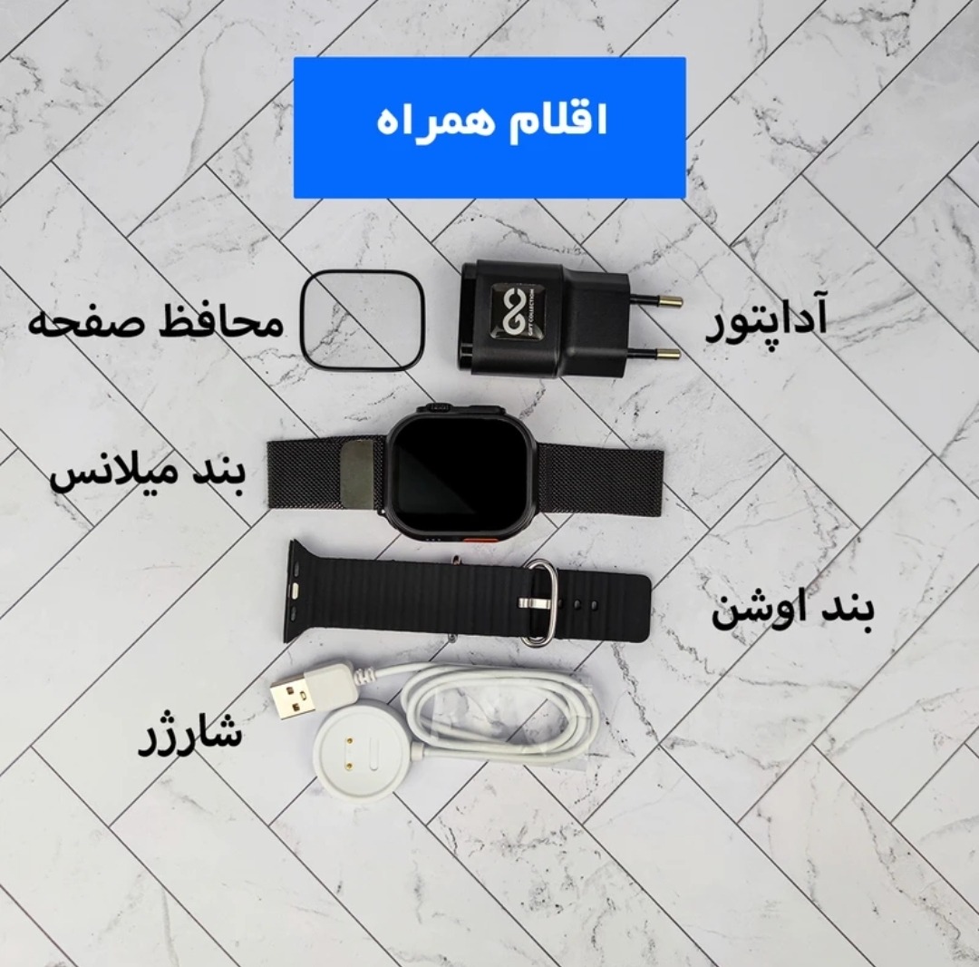 یک عدد بند سیلیکونی - یک عدد بند میلانس - محافظ صفحه نمایش - آداپتور مخصوص ساعت هوشمند - شارژر ساعت هوشمند و راهنمای نصب نرم افزار به صورت فارسی