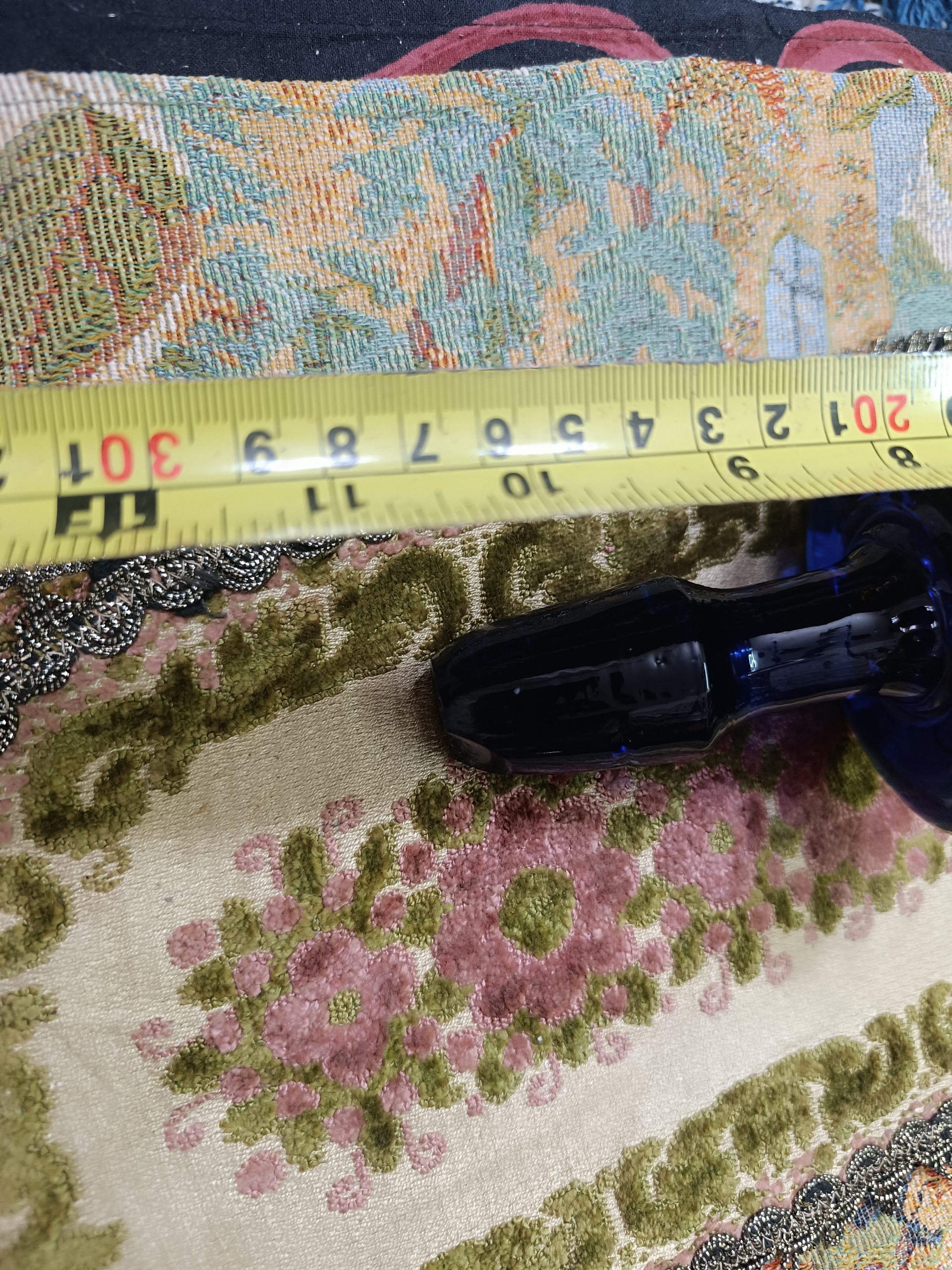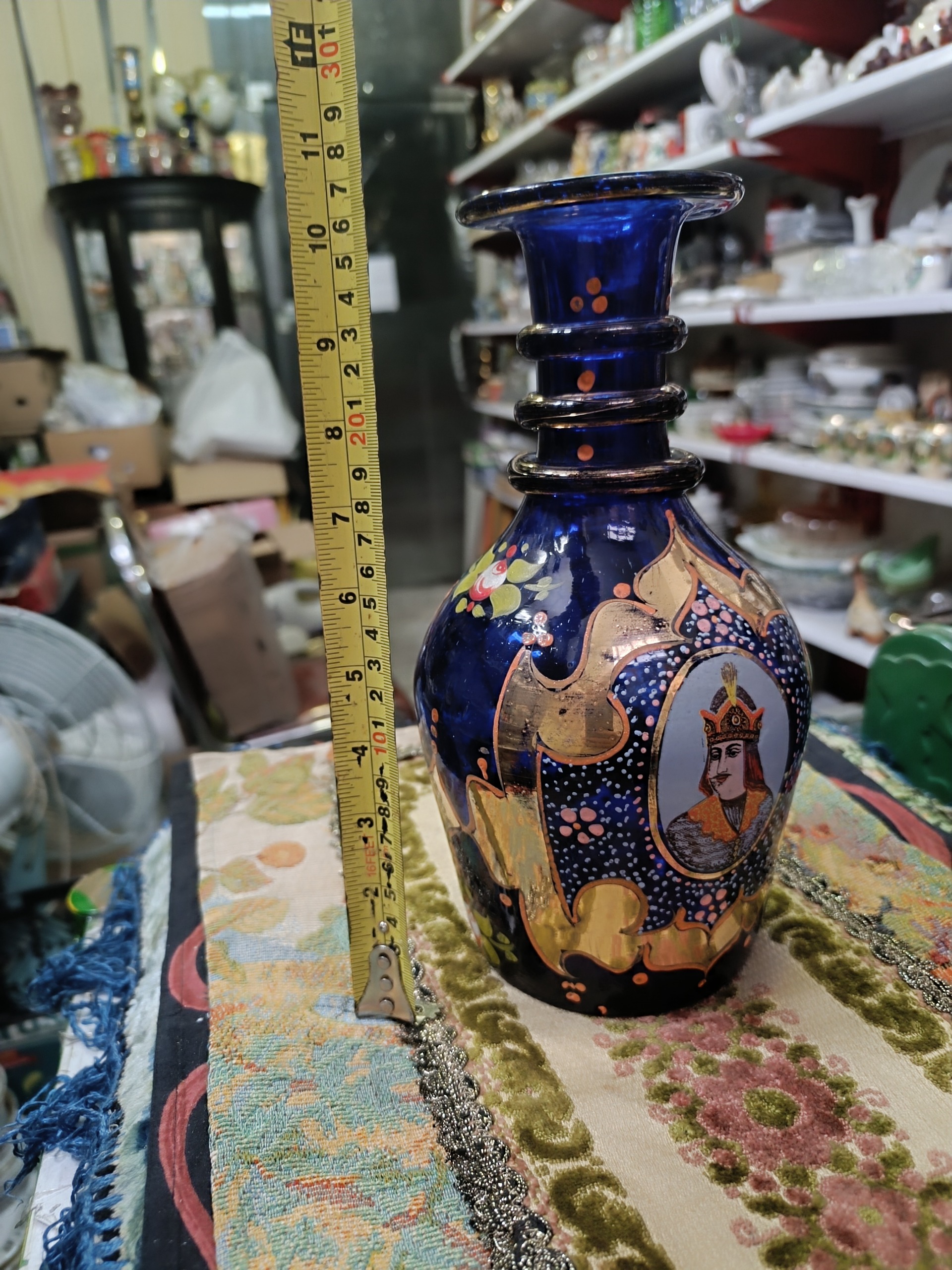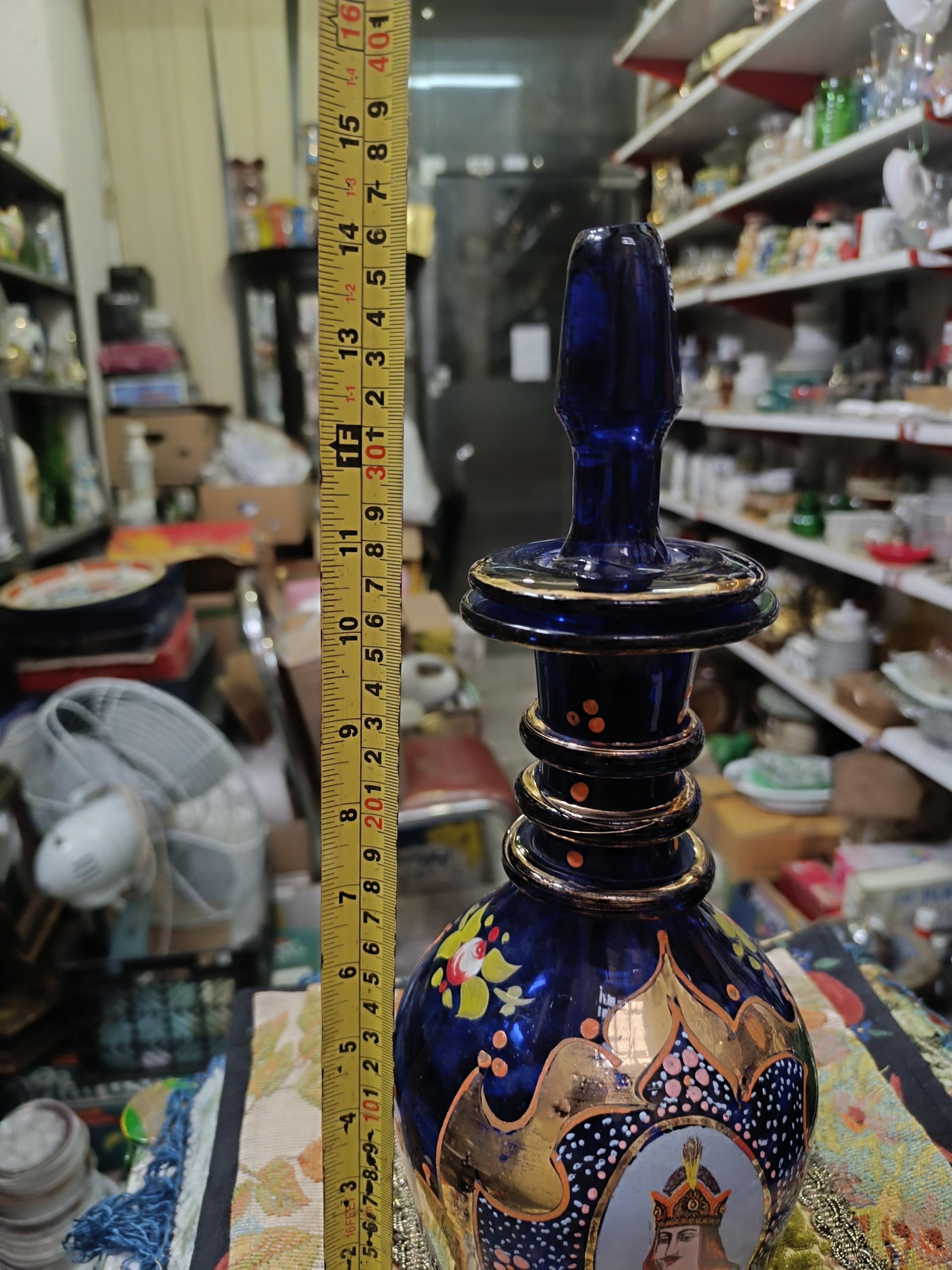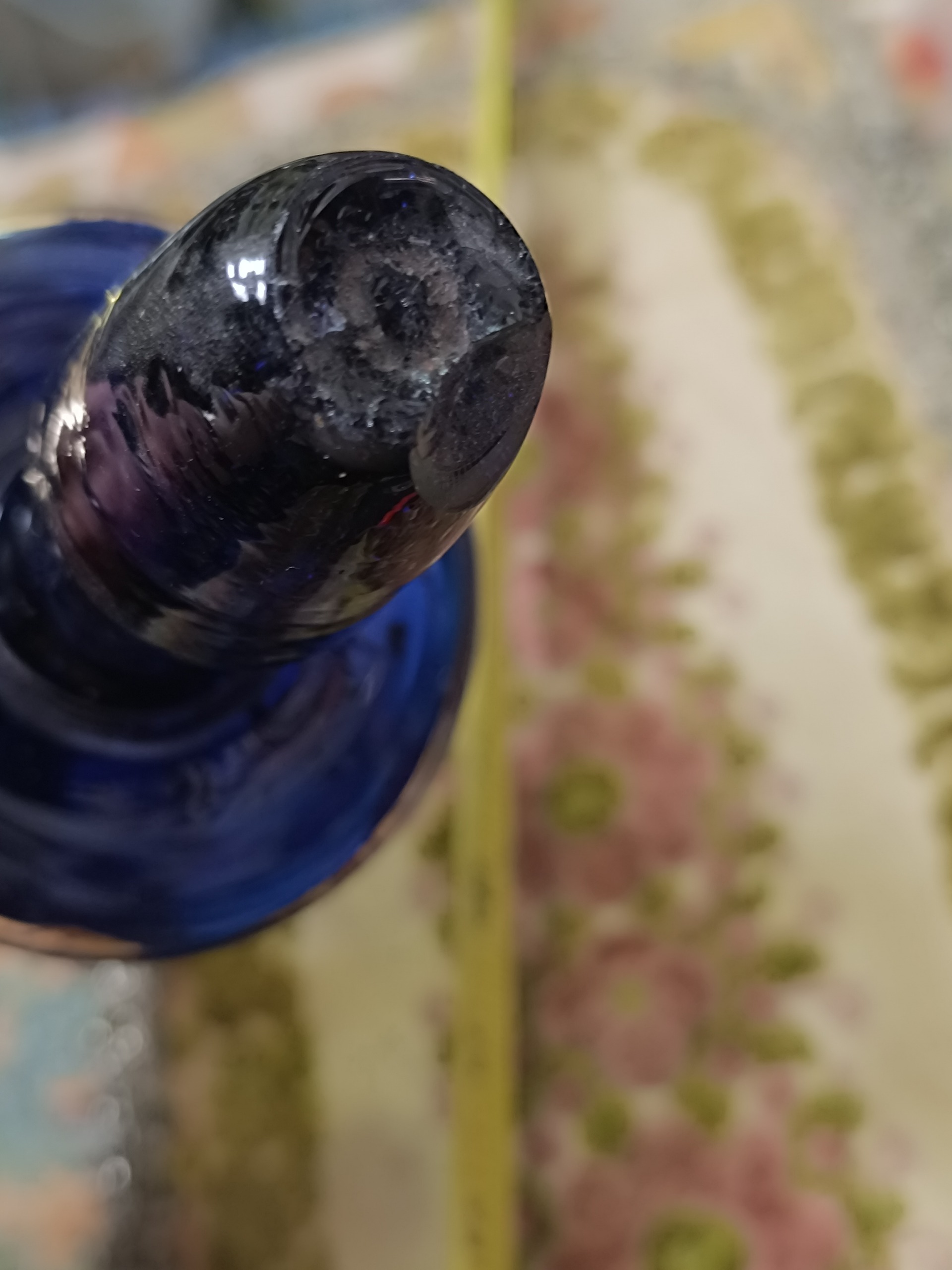 یک عدد تنگ بلور آبی ، درب نیزه ای ، از اون کارهای خاص و قدیمی و آنتیک ، یه پریدگی جزیی لبه بالایی نیزه داره توی عکس واضح مشخص شده ، کیفیت و ابعاد مطابق تصویر