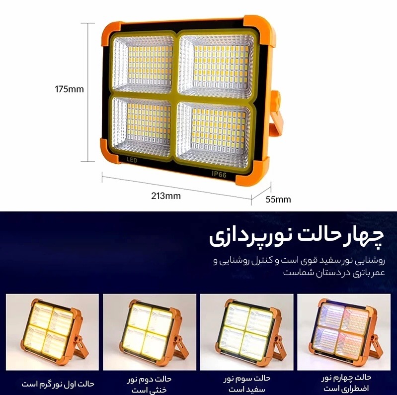 پروژکتور خورشیدی - با کیفیت نور فوق العاده خود در 4 حالت آفتابی-مهتابی- آفتابی مهتابی و حالت چشمک زن آبی و قرمز( )در زمان های اظطراری مورد استفاده قرار میگیرد این دستگاه هم با برق و هم با پنل خورشیدی تعبیه شده در پشت دستگاه شارژ میشود. این چراغ اضطراری بدلیل روشنایی بسیار خوبی که دارد می توان به راحتی از آن به عنوان یک چراغ مهتابی استفاده کرد و همچنین می توان نور آن را تنظیم کرد. این چراغ اضطراری در روز میتواند با استفاده از پنل خورشیدی شارژ شود تا در هنگام تاریکی شب از آن استفاده کرد. این چراغ اضطراری سبک را می توان به راحتی با نگهدارنده ای که دارد آویزان کرد. می توان از این چراغ اضطراری در شرایط و مکان های متفاوت اعم از کوهنوردی،گردش و قطعی برق و از آن استفاده کرد. این محصول از باتری شارژی 12000میلی آمپری قابل شارژ بهره می برد که به راحتی شارژ می شود به وسیله شارژ همراه آن قابل شارژ است. مدت زمان استفاده از این مدل در حالت کم نور7 الی 15 ساعت می باشد و در حالت پر نور 5 الی 10 ساعت می باشد. مدت زمان شارژ شدن این پرژکتور 5 ساعت می باشد