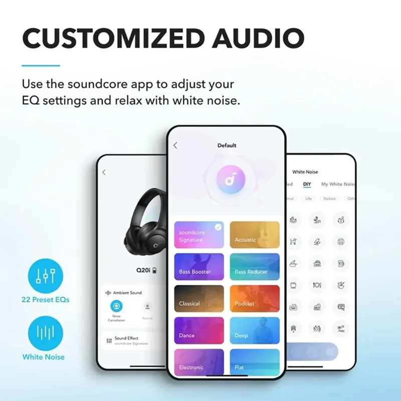 برنامه برای سفارشی سازی EQ: برنامه صداگذاری را دانلود کنید تا صدای خود را با استفاده از EQ قابل تنظیم، با 22 تنظیم از پیش تنظیم کنید، یا خودتان آن را تنظیم کنید. همچنین می توانید بین 3 حالت ANC، Normal و Transparency جابجا شوید و با نویز سفید کنید.