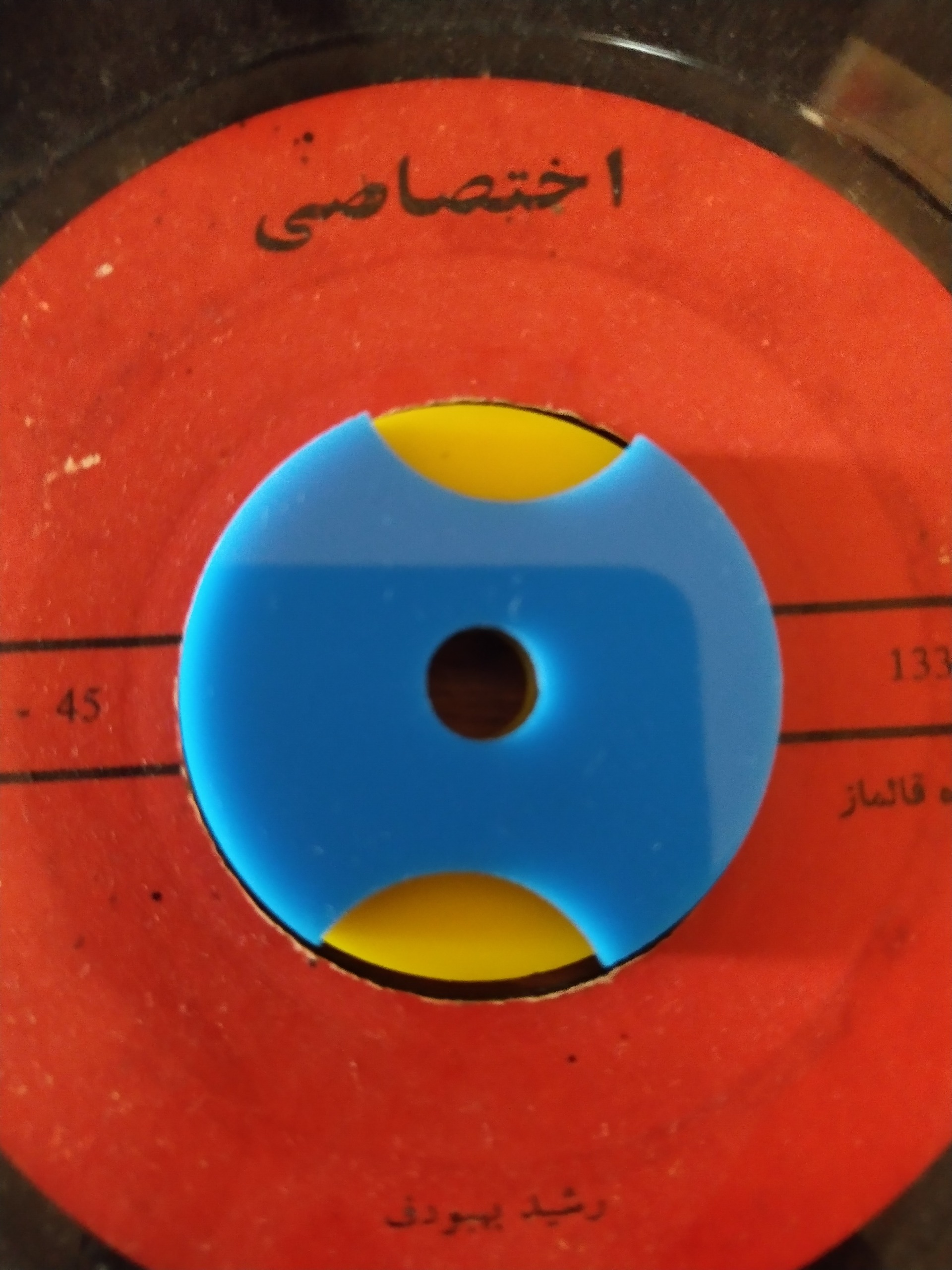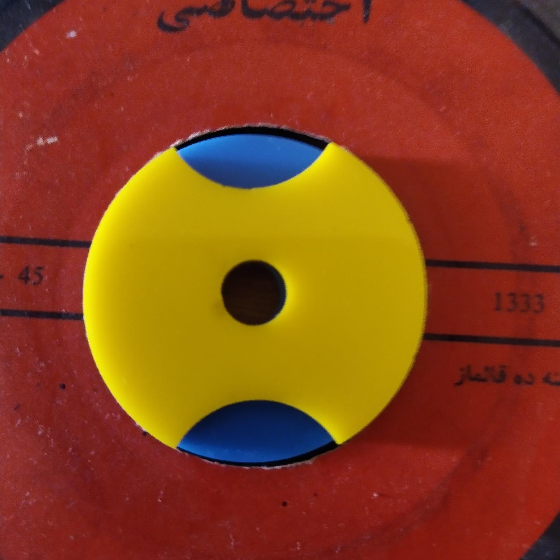 وسط صفحه 45دور جدید ساخته شده از پلاستیک فشرده برابر شکل قیمت هر کدام 50هزار تومن است.رنگ زرد یا آبی و یا تلفیقی و در هر دو حالت.بر اساس سفارش مشتری ارسال میشود.