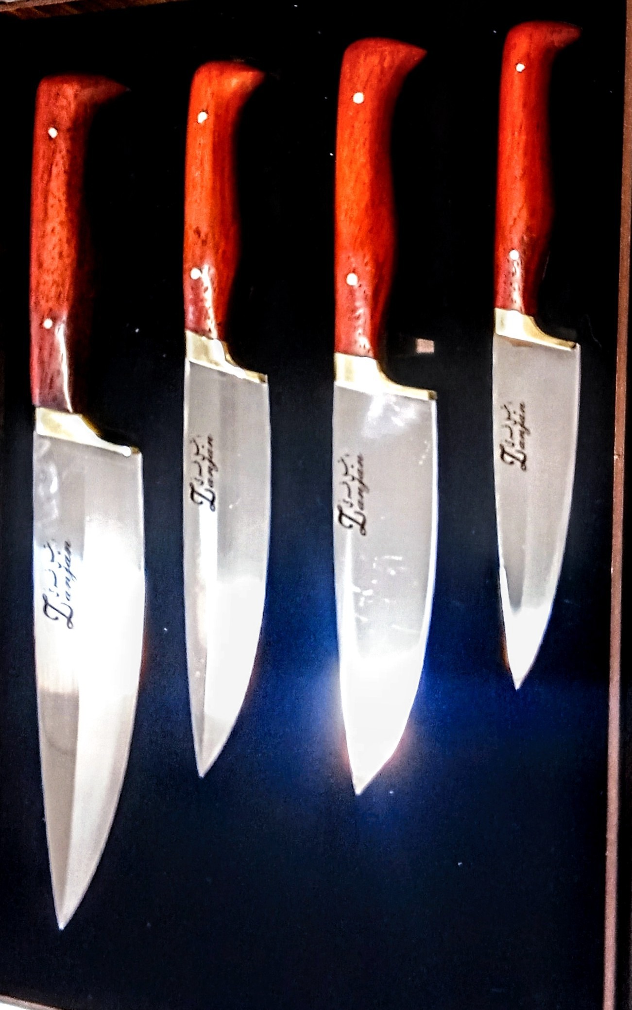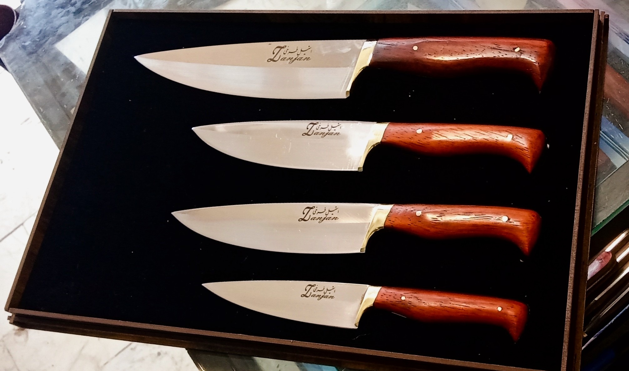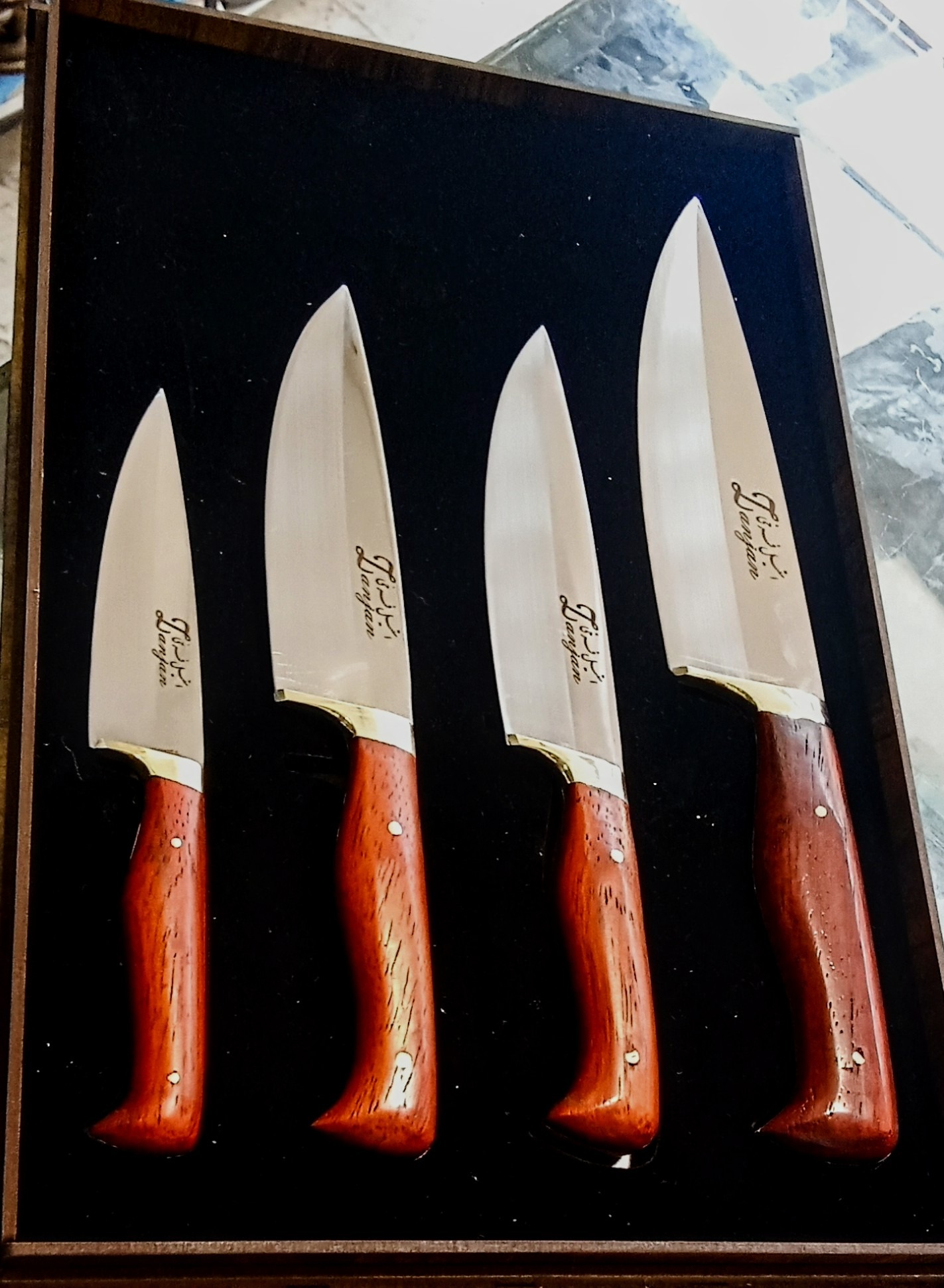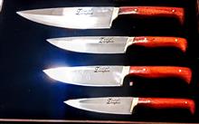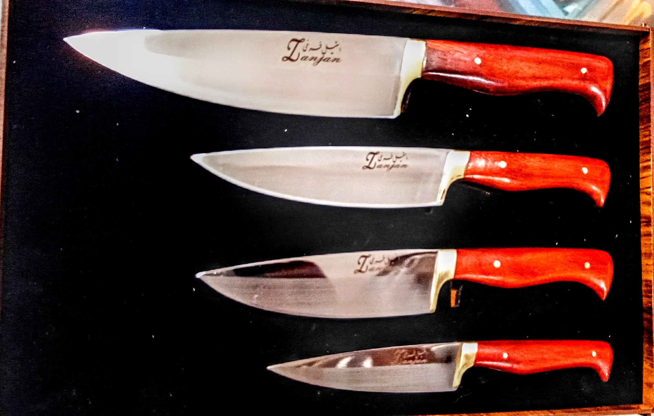 چاقو ست اشپزخانه چارتایی استیل نیمه براق ابدیده تضمینی ودسته پادوک کاردست استادفرخی ضمانتداردرجه یک مناسب جهیزیه کادو وبهترین سوغات زنجان همراه جعبه چوبی ضمانت تعویض وبرگشت پول بدون بهانه وهرگونه سفارش چاقو بازاری وکلکسیونی پذیرفته میشود